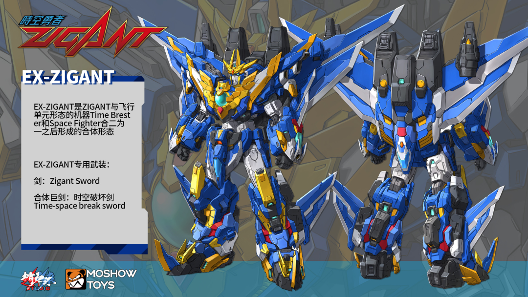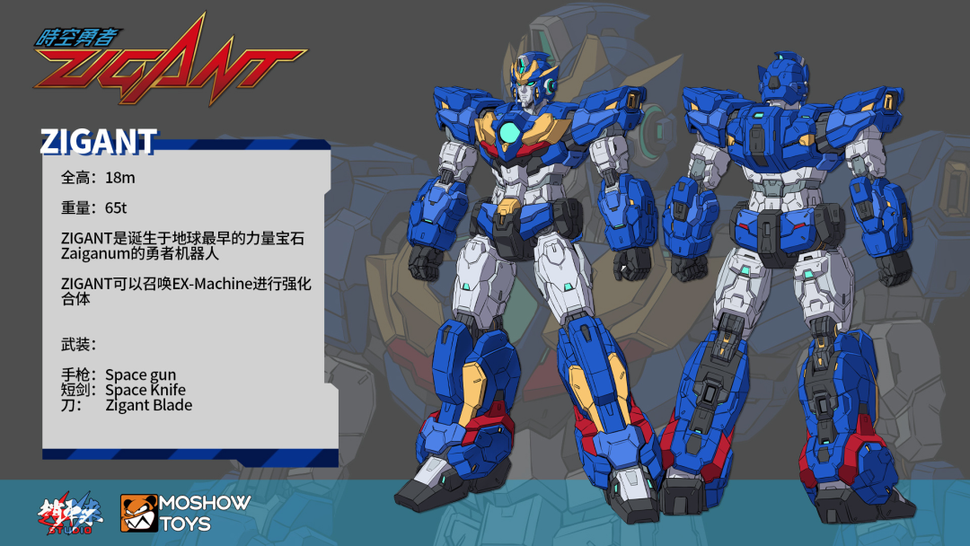 현재 공개된 설정 이미지들을 보면…설정 크기는 18m이고, 자이간트는 EX 머신이라 불리는 강화 파츠(타임 브레스터, 스페이스 파이터)를 통해 엑스 자이간트로 합체할 수 있으며, 스페이스 건(피스톨), 스페이스 나이프(대거), 자이간트 블레이드, 자이간트 소드(EX-자이간트 전용), 여기에 자이간트 블레이드와 자이간트 소드를 합치면 타임 스페이스 브레이크 소드라는 필살 무기를 구현할 수 있다고 하는군요.