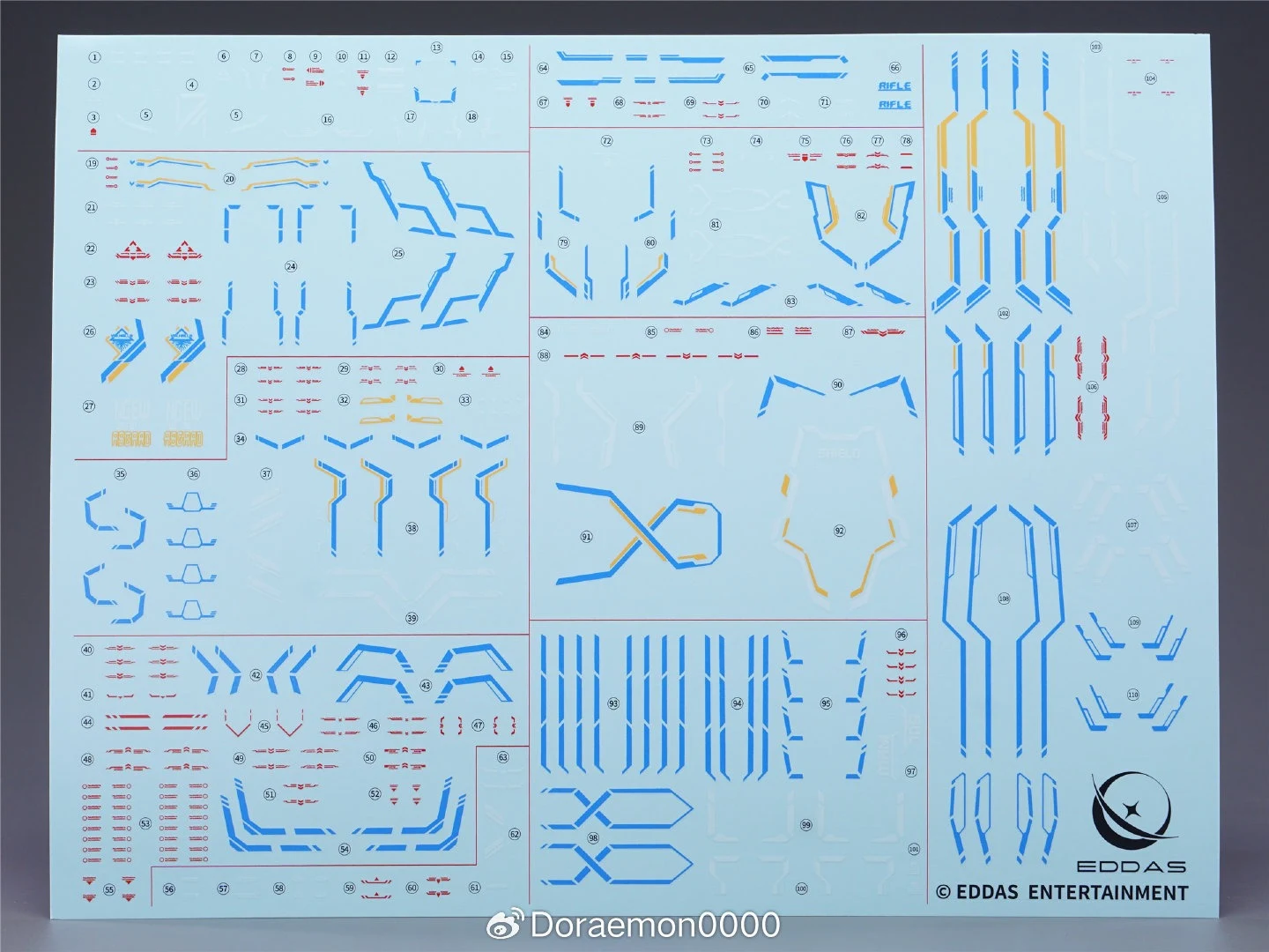 | 습식 데칼은 커다랗게 1장이지만 부위별로 구분선 처리가 되어있습니다 BUT, 블루 컬러여서 오렌지 컬러 외장 조립시에는 사용하기 힘들겠네요; |