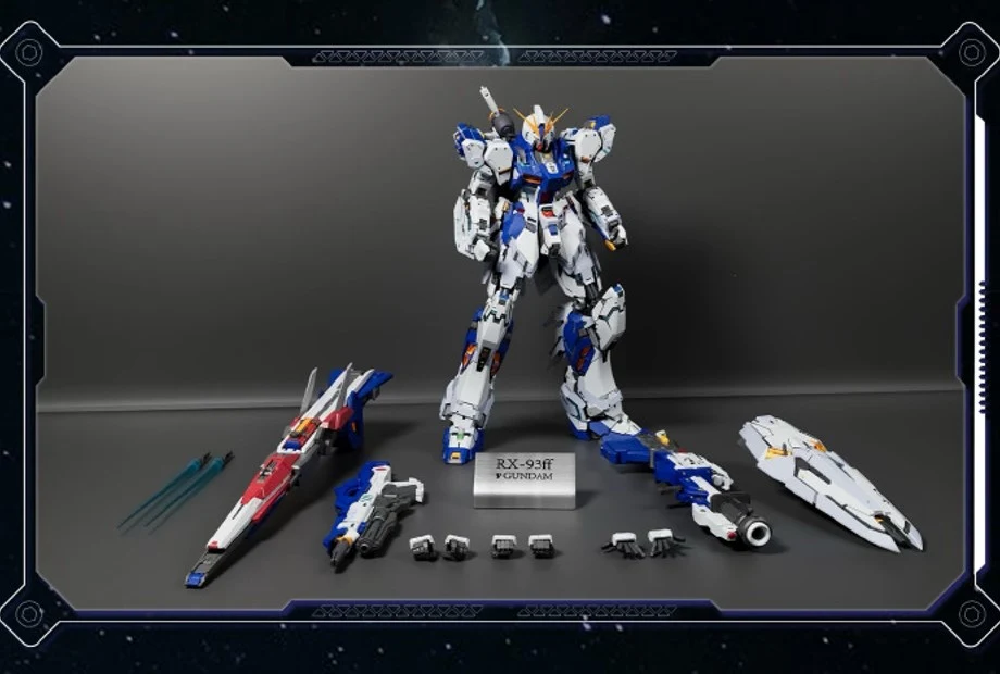 제품 정보를 살펴보면…크기는 약 23cm, 소재는 ABS, POM, PS, PC가 사용되며 버니어 및 사이코 프레임은 모두 색 분할 적용되어 있습니다. 요즘 자주 보이는 POM 파츠는 내부 프레임과 관절에 사용됐을 것으로 보이네요. 초회 예약 가격은 218위안이고, 특전으로는 ‘RX-93ff v GUNDAM’ 금속 명판이 제공됩니다. 출시 예정시기는 2025년 4분기입니다.
