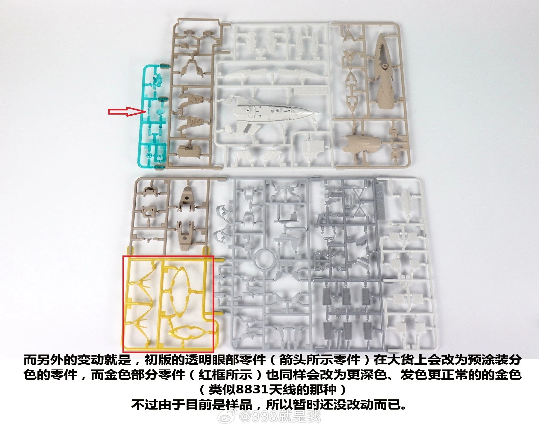 | * 위의 화살표 표시된 눈 부위 파츠는 양산품으로 나올 때 사전 도색 처리될 예정 ** 아래 골드 컬러 파츠는 양산품으로 나올 때 좀 더 진한 색으로 변경 예정 |