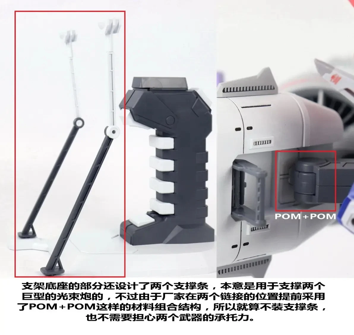 | 보조 스탠드 파츠가 있어 미티어 유닛의 거대한 빔 포 부분을 받쳐줘 지탱할 수 있으며 몸체와의 연결/가동 부위는 경도가 우수한 POM+POM 소재가 적용됐습니다 * POM 소재가 적용되어 보조 스탠드가 없어도 버틸 순 있음 |