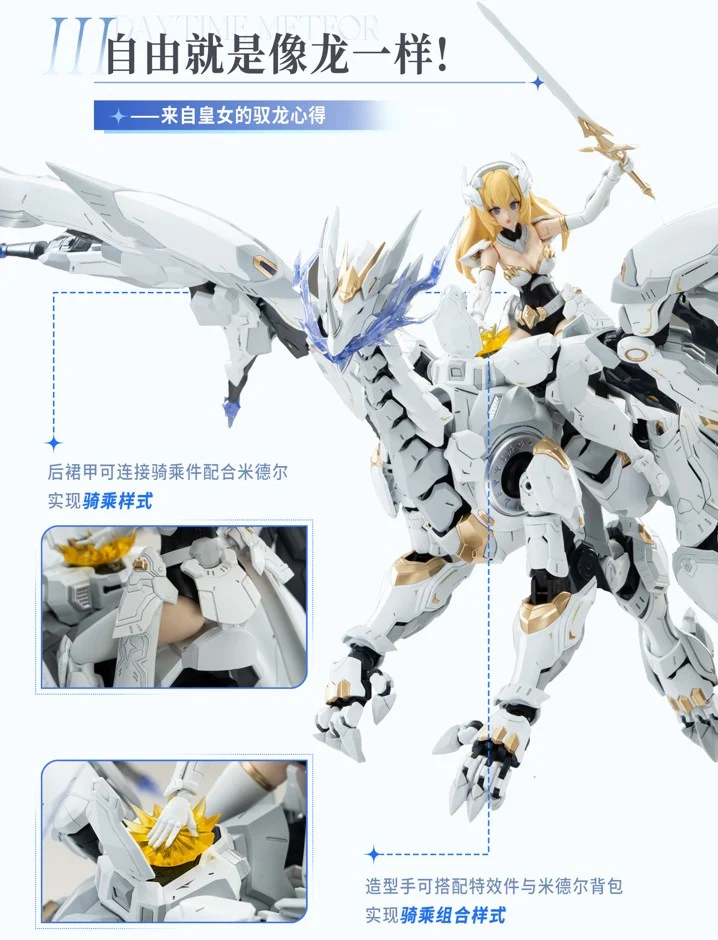 우선 데이타임 메테오는 소울링토이즈의 오리지널 IP ‘아우도 리스토어 하트’를 기반으로 ‘데이타임 던’이라는 소녀 기사(황녀라는 설정)와 ‘메테오 메더’라는 메카 드래곤으로 구성된 프라모델 제품입니다. 특히 메카 드래곤 메테오 메더의 경우, 폭 86cm, 길이 63cm로 엄청난 볼륨으로 관심을 모으기도 했죠.