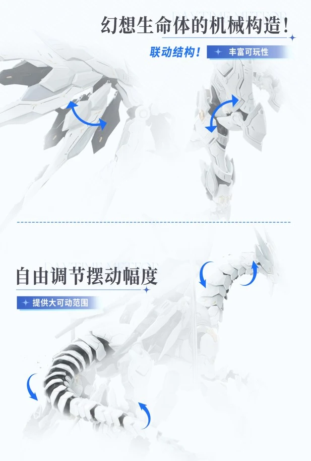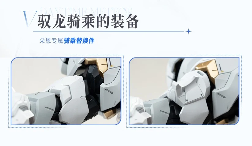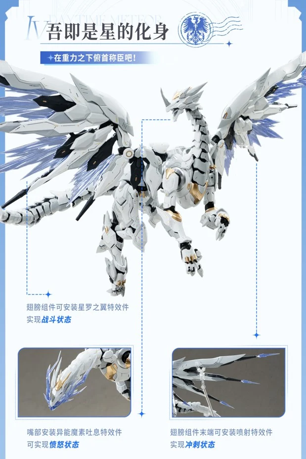 | 1) 메테오 메더의 날개에 이펙트 파츠를 장착해 전투 모드 구현 2) 입 부분에는 '마소'를 뿜는 이펙트 파츠를 적용해 분노 모드 구현 3) 날개 끝 부분에 분출 이펙트 파츠가 있어서 부스트 모드 구현 |