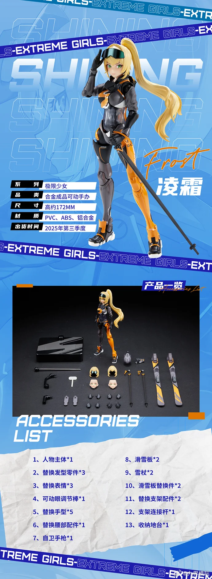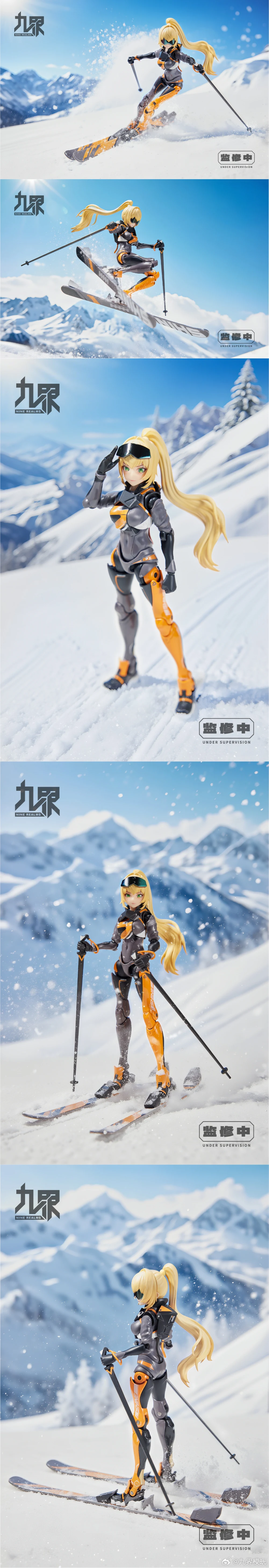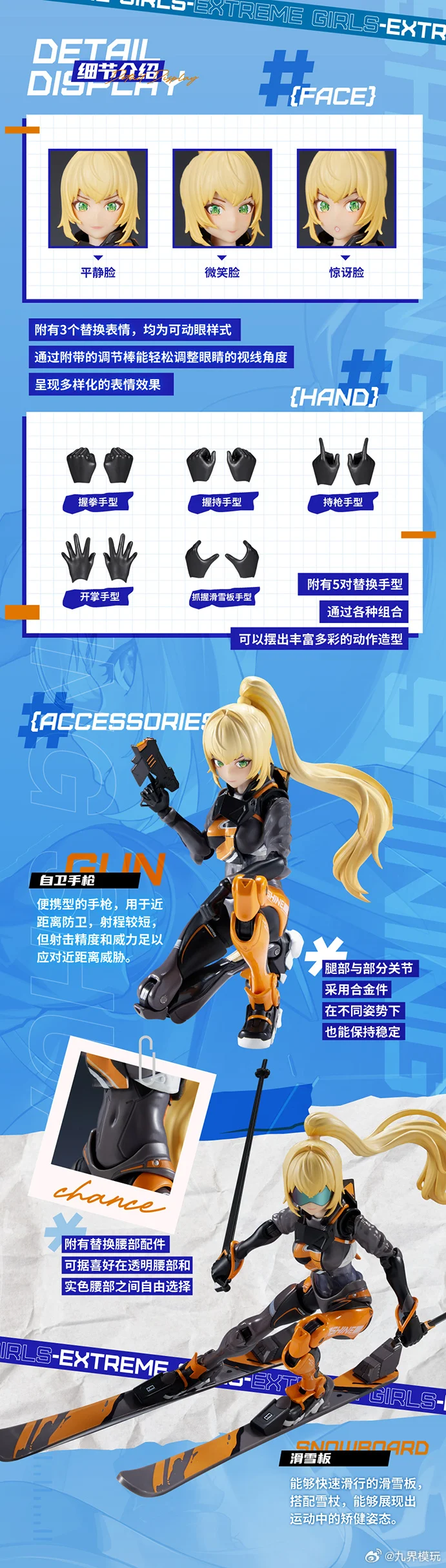스키 타는 소녀에 신체 여러 부위에 기계 파츠 요소가 더해져 얼굴은 인간 소녀지만 몸은 안드로이드 느낌이 나는 디자인이네요. 얼굴 파츠는 3개가 동봉되며 3가지 표정, 그리고 눈동자는 모두 가동형입니다. 조형손은 5세트, 권총 무장 파츠와 스키 장비, 고글도 동봉됩니다. 배 부위는 클리어 파츠로 내부가 비춰보이는데, 비춰보이지 않는 배 부위 파츠도 동봉되어 선택 장착할 수 있습니다.