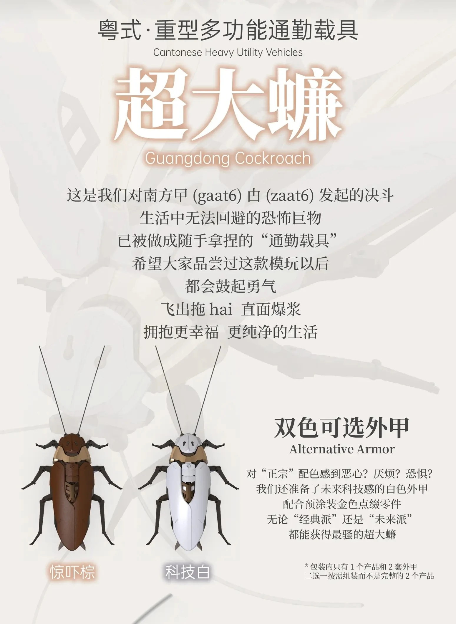 앞서 백로 에어컴뱃 커스텀을 출시했던 중국 모형업체 로복스에서 충격과 공포의 바퀴벌레 프라모델 신제품을 공개했습니다. 이름하여 광둥성 바퀴벌레;; 사실 중국 광둥성에선 바퀴벌레로 인한 음식 위생 문제가 빈번하게 발생하고, 개체의 크기도 우람한터라…일종의 조롱 느낌으로 광둥성 바퀴벌레를 언급하곤 하는데요. 로복스에선 이걸 프라모델화해버렸네요;;