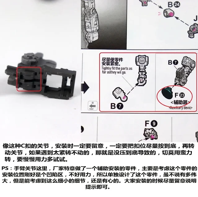 | C형 관절 부분 조립시 반드시 파츠를 끝까지 밀어넣어서 끼워줘야 합니다. 만약 해당 부위를 가동시켰을 때 너무 타이트한 느낌이 나면서 제대로 가동이 되지 않으면 파츠가 제대로 조립되지 않아서 그렇다고 하네요. 업체 쪽에서 파츠를 끝까지 밀어넣기 쉽도록 별도로 조립 보조 툴 파츠(F23)도 추가했으니 설명서 보시면서 잘 활용하시기 바랍니다 ^^ |