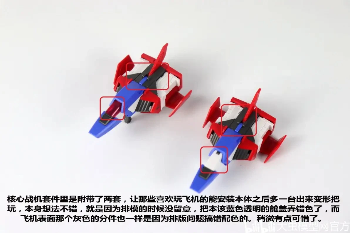 | 코어 파이터는 2개가 동봉되어 있어서 내부 삽입용과 외부 전시용으로 사용 가능합니다. 그 외, 설정 컬러 구현 부분에서 조종석 클리어 파츠 컬러가 블루가 아닌 레드라는 점, 윗면 컬러가 화이트가 아닌 그레이라는 점이 쪼금 아쉽다고 하는군요 |