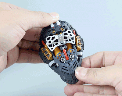 | 콕핏에도 연동 기믹이 적용됐습니다. 하단의 검정색 덮개 파츠를 아래로 내리면 상단 덮개가 연동되어 열리며 동시에 둥근 조종석이 앞쪽으로 나옵니다 |