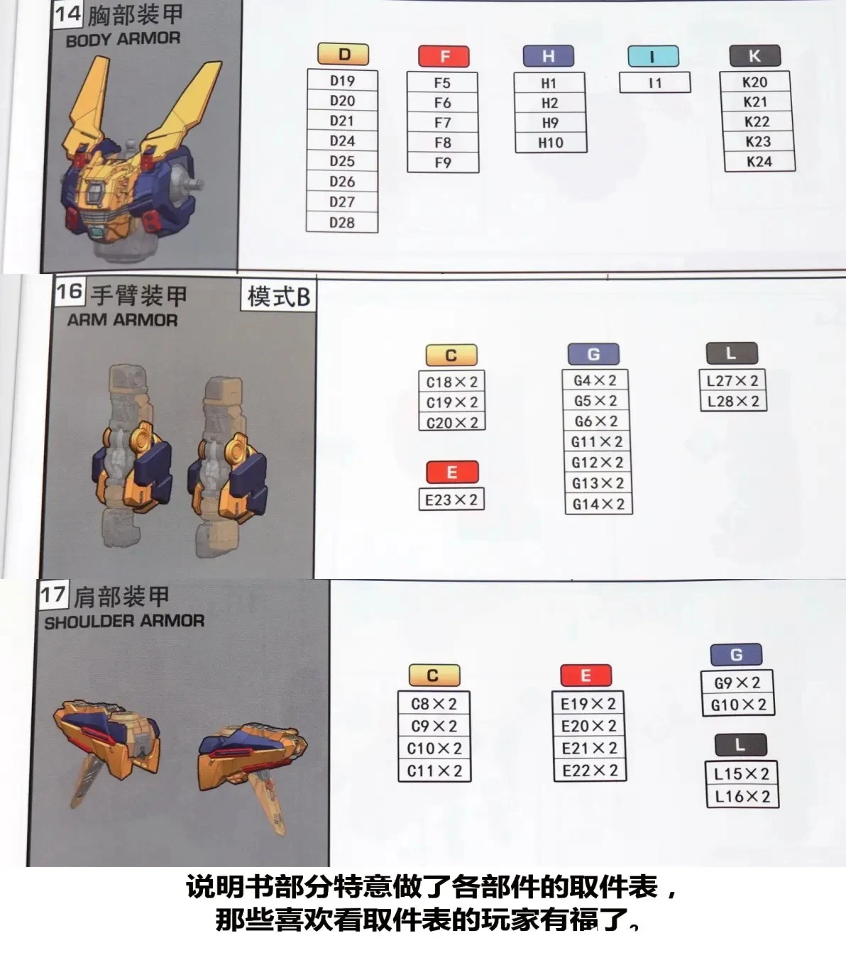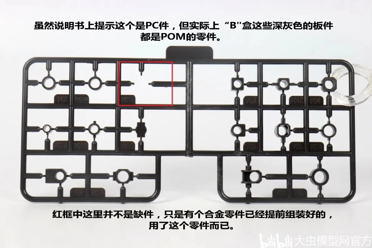 설명서에는 PC 소재로 표시되어 있지만 박스 B에 동봉된 다크 그레이 컬러 런너는 모두 POM 소재입니다. 빨간 네모에 없는 부품은 부품 누락이 아니라 합금 관절 부분에 이미 들어가 있는 부품 |