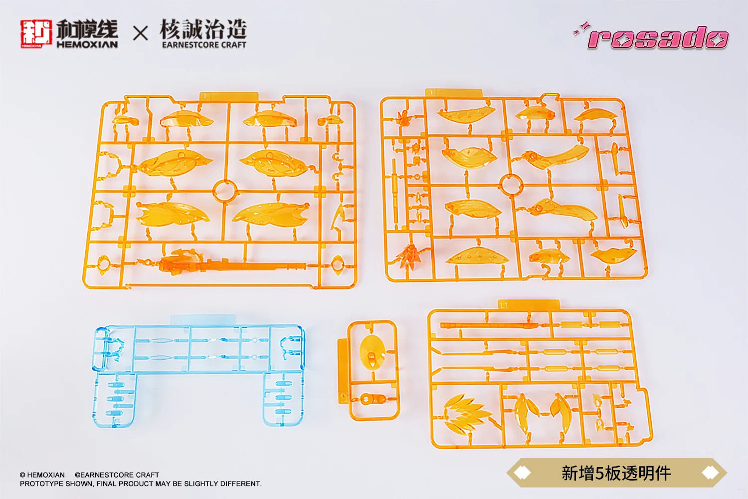 | 출시 지연 보상은 클리어 파츠 런너 5장입니다. 4장은 파이어 릴리 구현용 교체 클리어 파츠이며 1장은 기존 제품의 가슴/무릎에 적용된 노란색 클리어 파츠를 푸른색으로 교체 적용할 수 있는 파츠입니다. |
