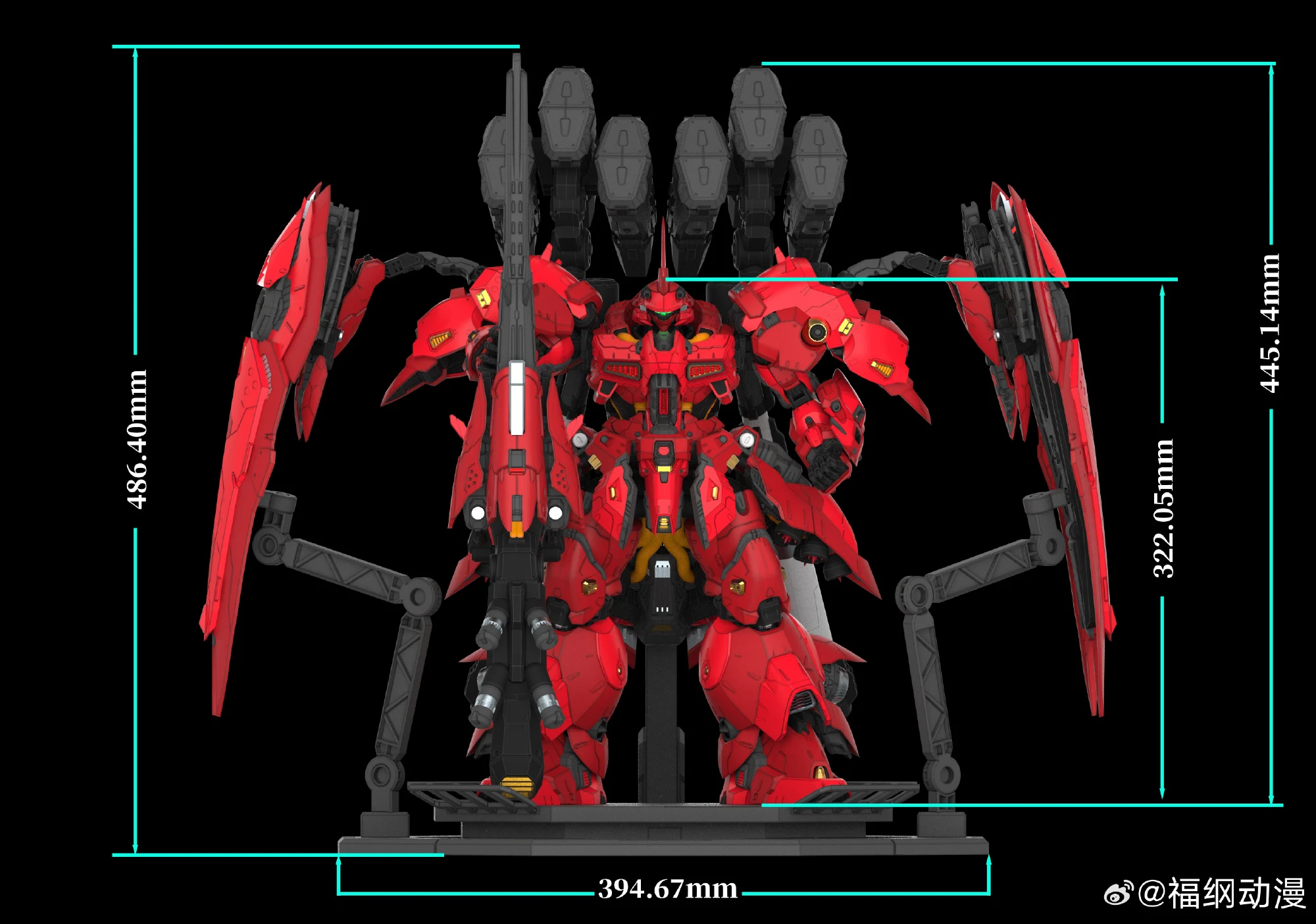 | 크기는 머리까지 32.205cm, 미사일 포드까지 44.51cm, 액션베이스의 폭은 39.467cm, 베이스 높이를 포함한 롱 레인지 라이플의 높이는 48.64cm |
