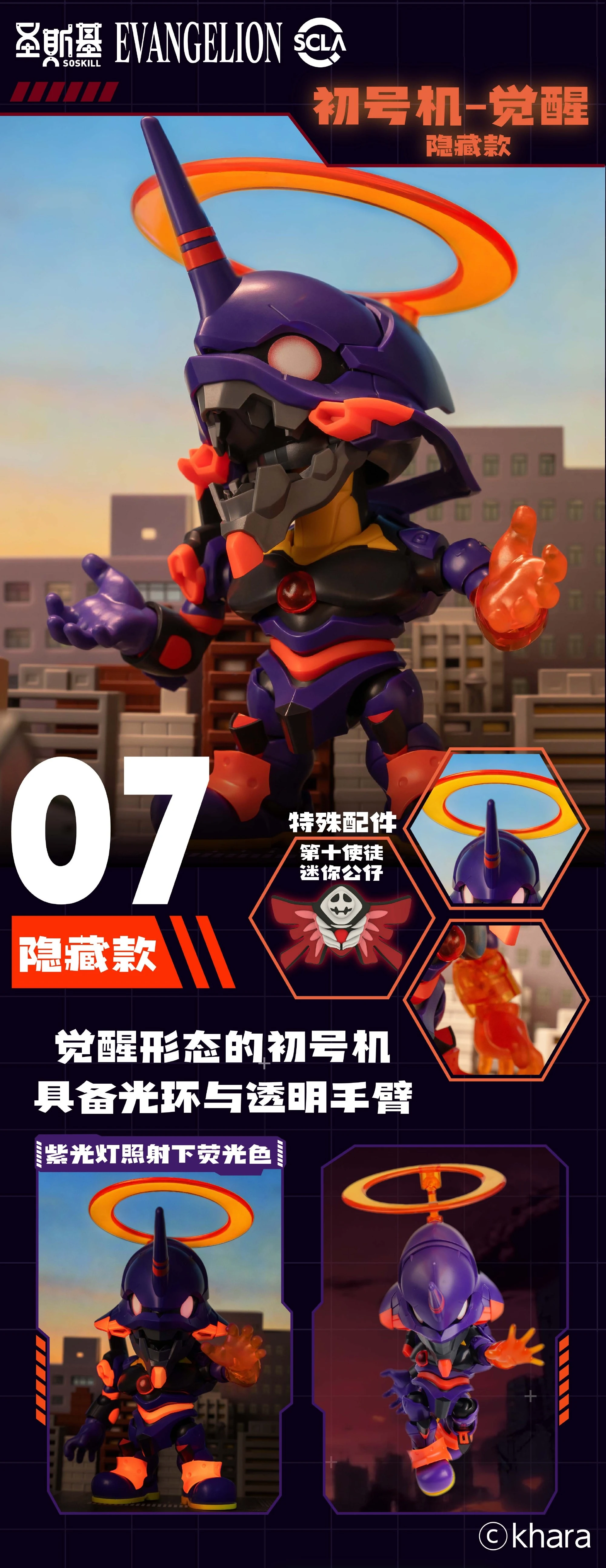 | 시크릿 각성 초호기 - 오렌지 컬러 클리어 팔 파츠 - UV 조명을 비출 경우 발광하는 엔젤링 - 제10사도 미니 피규어 동봉 |