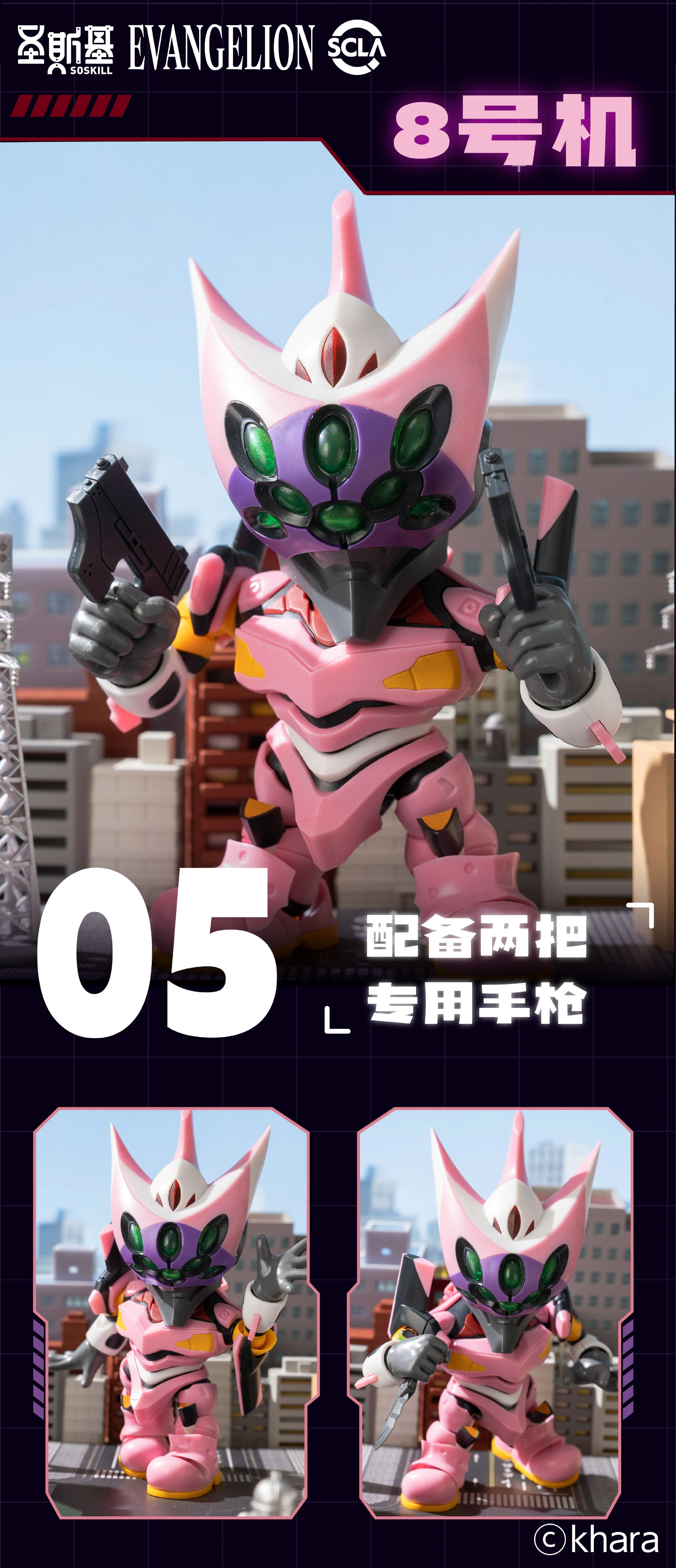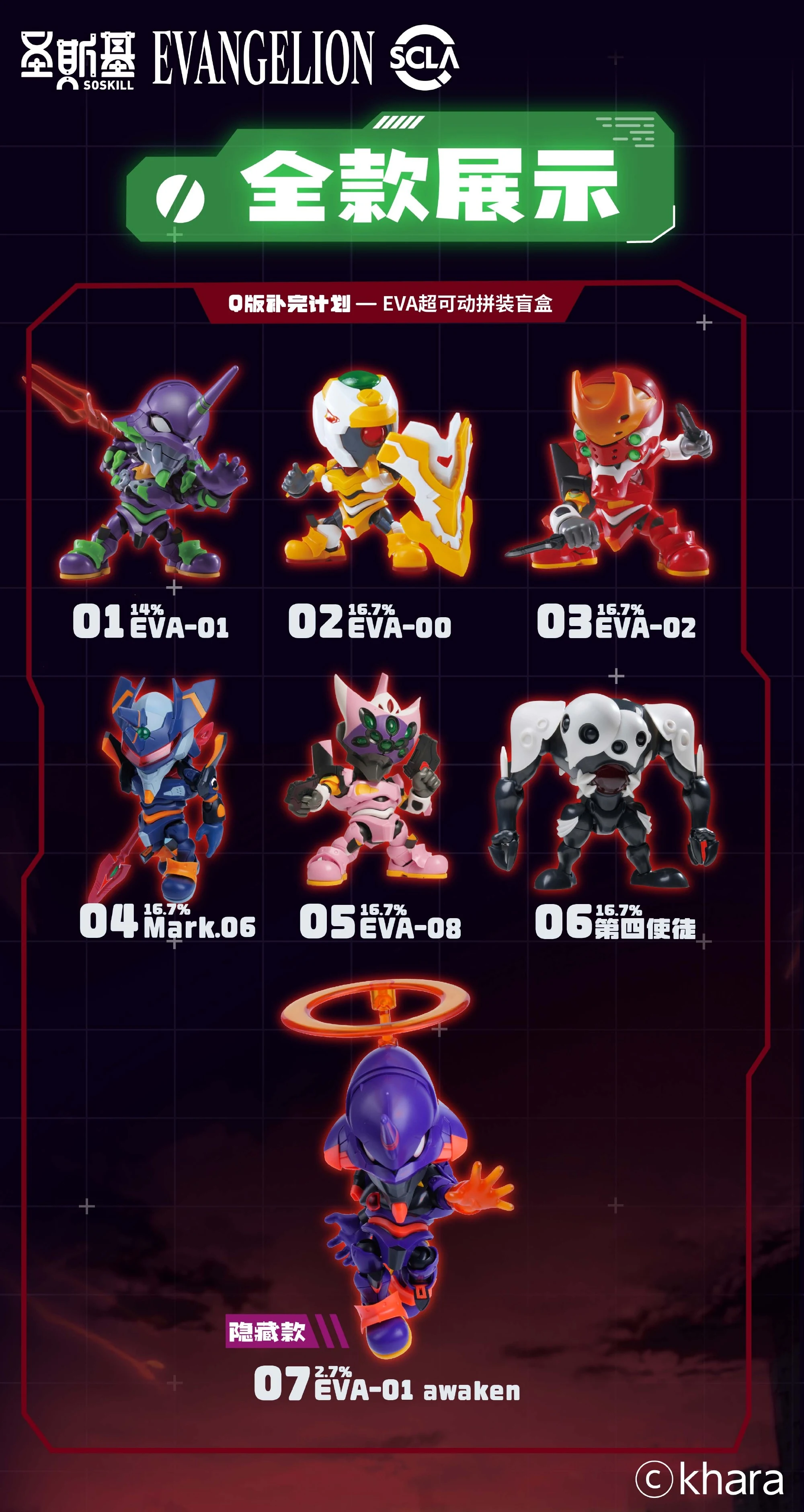 | 에바 초호기, 0호기, 2호기, 마크6, 8호기, 제4사도 총 6종이며 시크릿으로 각성 초호기가 들어있습니다 시크릿은 대략 2.7% 확률이어서 쉽지 않네요 ^^; |