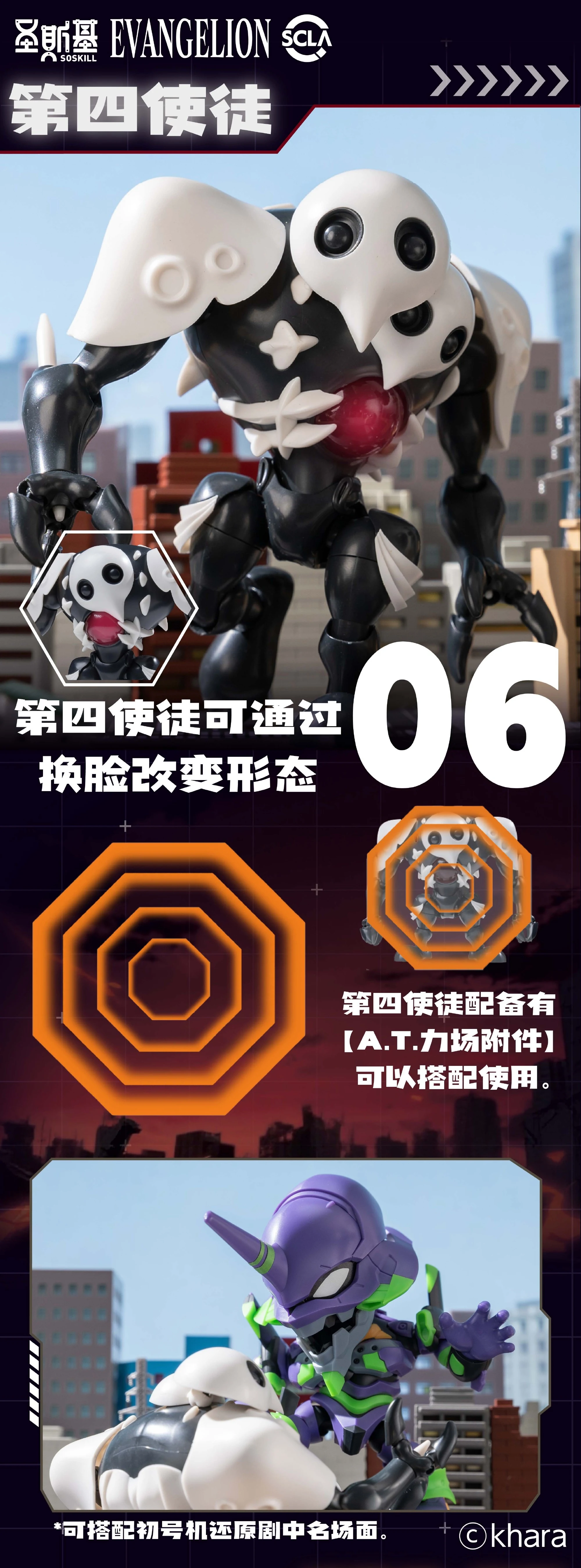 | 제4사도 - 얼굴 파츠 교체 통해 형태 변경 가능 - AT역장 파츠를 통해 초호기와의 대결 장면 구현 |