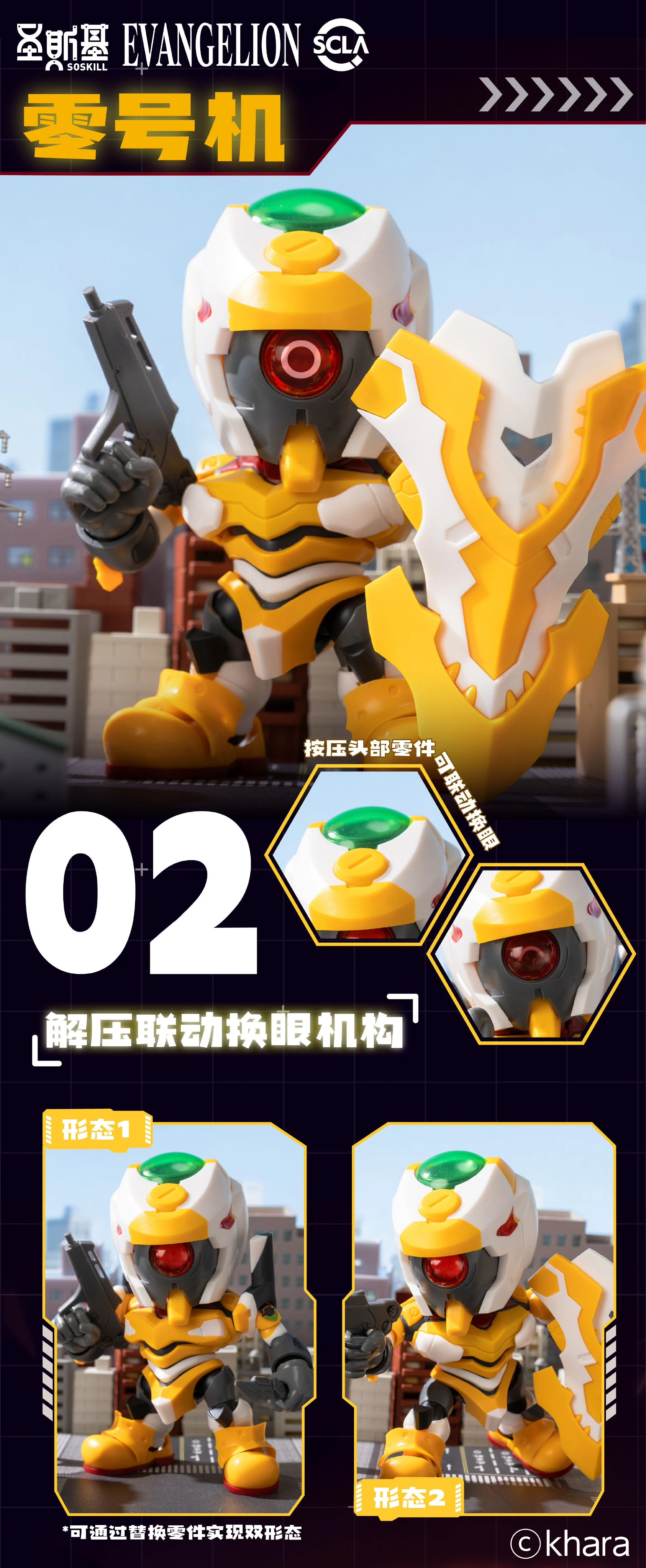 | 0호기 - 파츠 교체를 통해 2가지 형태 구현 - 전용 실드 파츠 동봉 - 머리 부분을 누르면 눈동자 변경 가능한 연동 구조 적용 |
