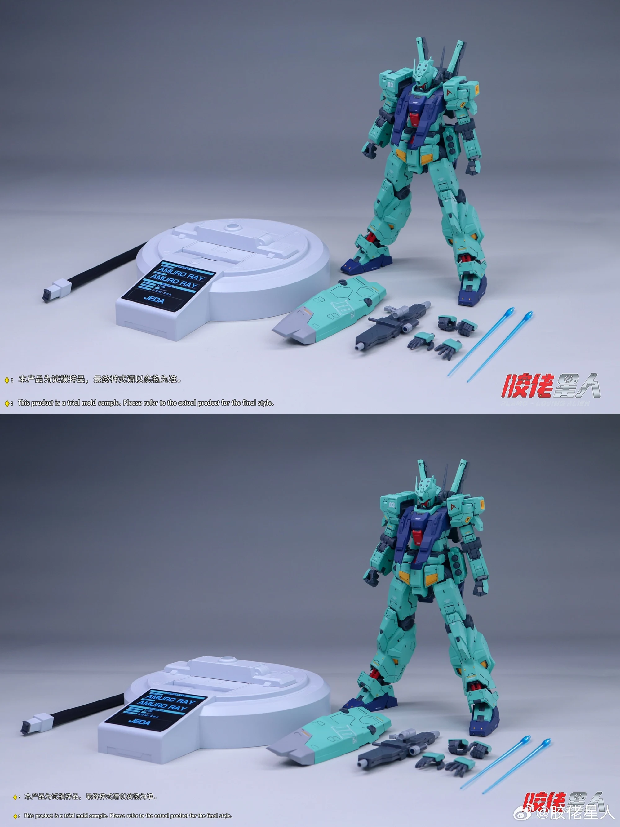 제품을 살펴보죠. 우선 아무로 전용 컬러(리백의 디제 느낌)와 외부 장갑이 적용됐으며 빌파 스타일 액션베이스는 화이트 컬러로 변경됐습니다. 그리고 액션베이스에는 자바라 스탠드가 들어가고, 머리에는 블루 컬러 센서 LED 램프가 삽입되네요. 뿔은 교체 조립할 수 있구요 ㅎㅎ 가격은 158위안으로 이전 기본 제다보다 20위안 인상됐고, 출시 예정시기는 11월입니다.