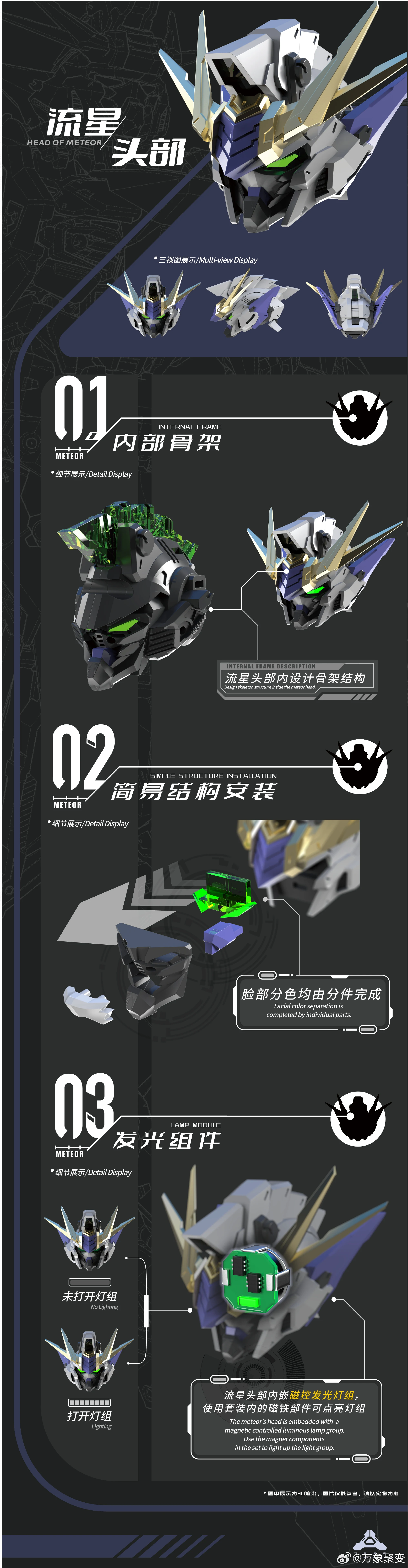 - 구성품: 소체, 무장 백팩(호바), 격납고 베이스 세트(엔지니어링 비클/미니 피규어/기본 액션베이스/자바라 봉 등), 3D 입체 스티커(호일), 메탈 에칭 파츠, LED 유닛(머리 부위 삽입, 자석 ON/FF) 등