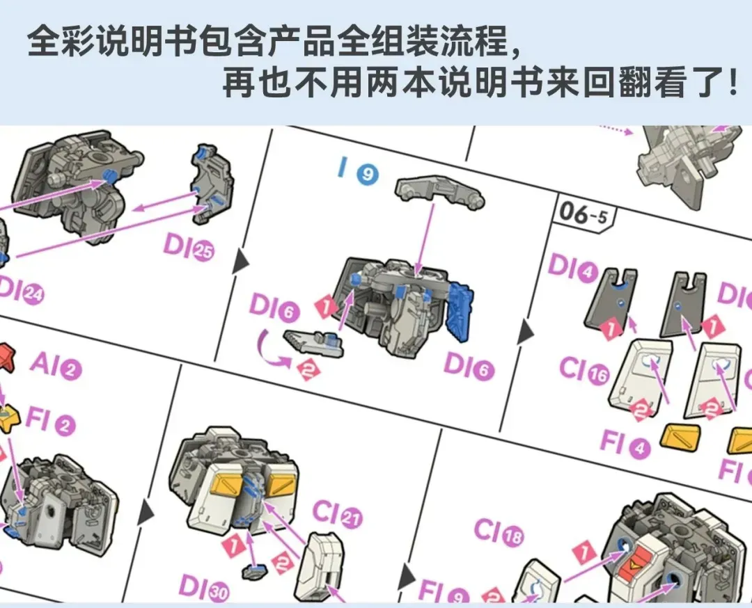 외관 컨버전킷이지만 가동성도 소체에 뒤지지 않으며, 자연스러운 무릎 앉아 자세가 가능합니다. 설명서는 풀컬러로 제작됐으며 모든 조립 과정이 담겨져 있어서 더이상 설명서를 뒤집어가며 보시지 않아도 됩니다. 그 외에 런너 넘버가 잘 보이도록 조치했고 넘버도 반다이 런너와 중복되지 않게 조정해 더이상 헷갈리지 않도록 했습니다.