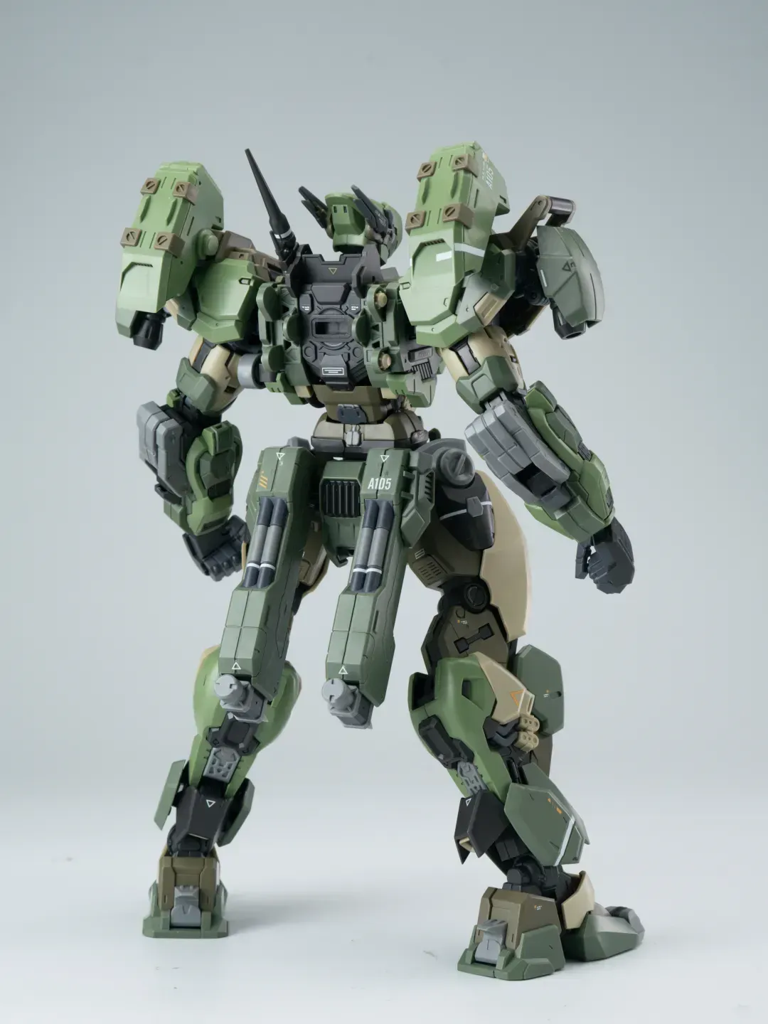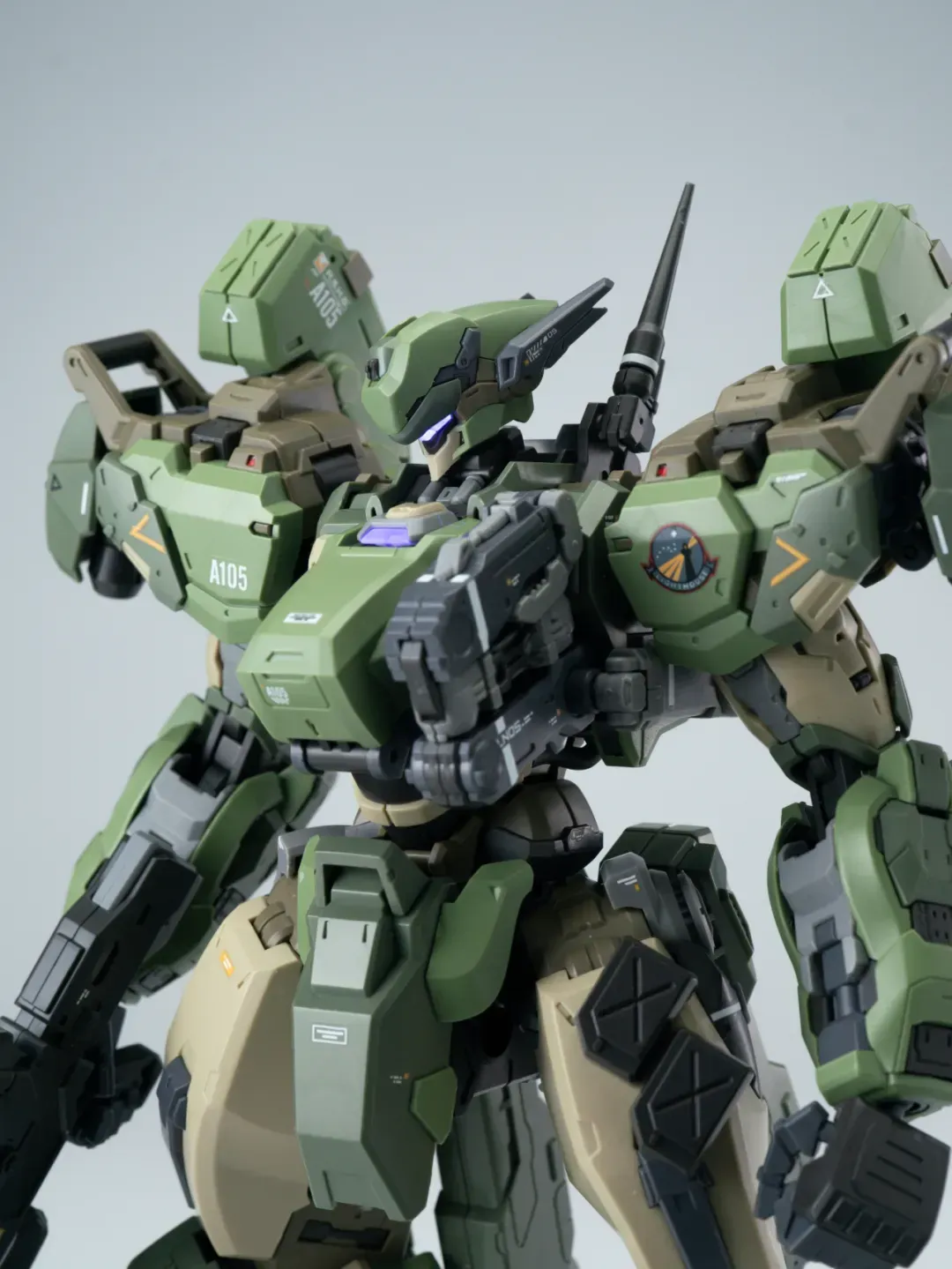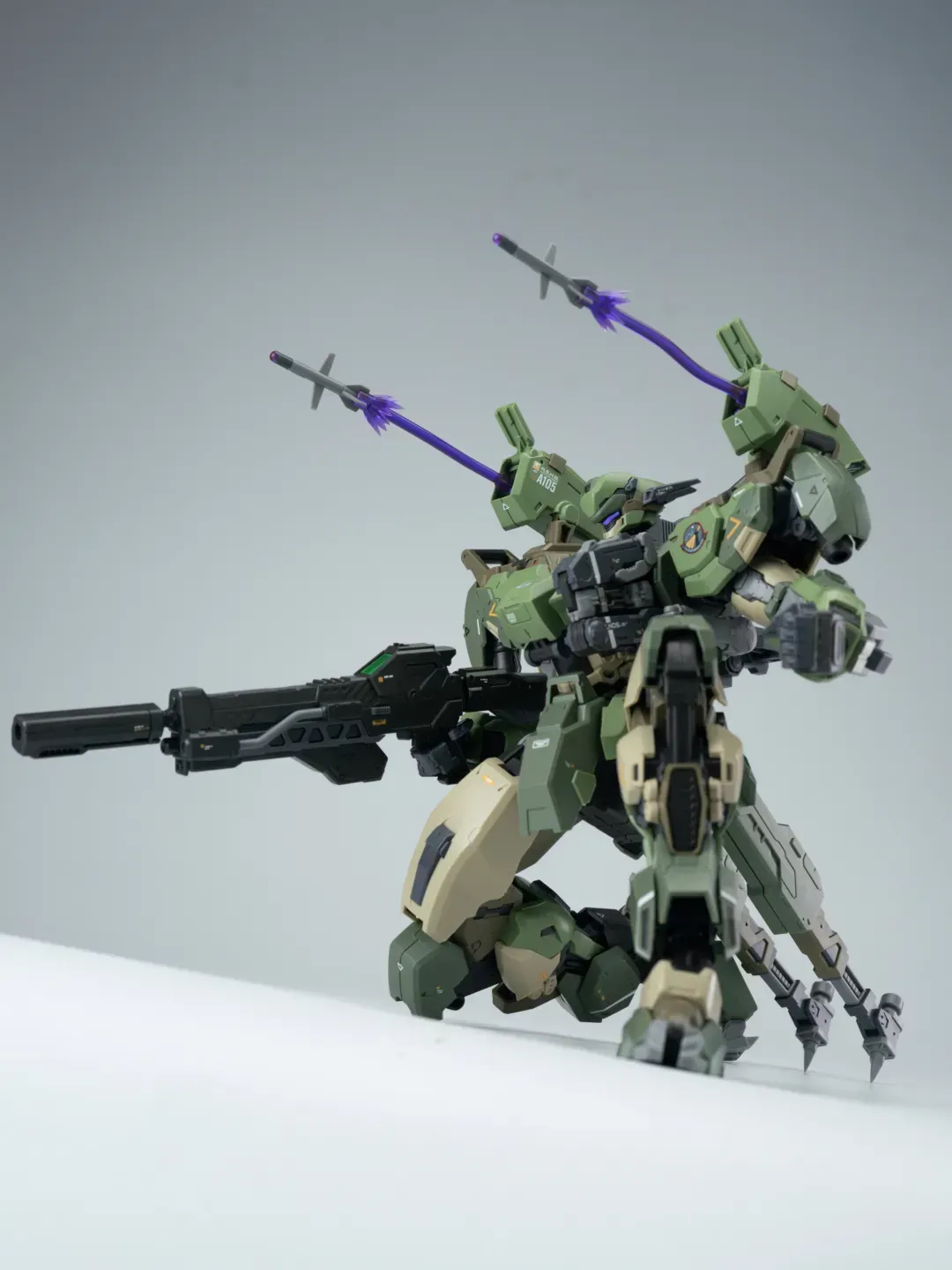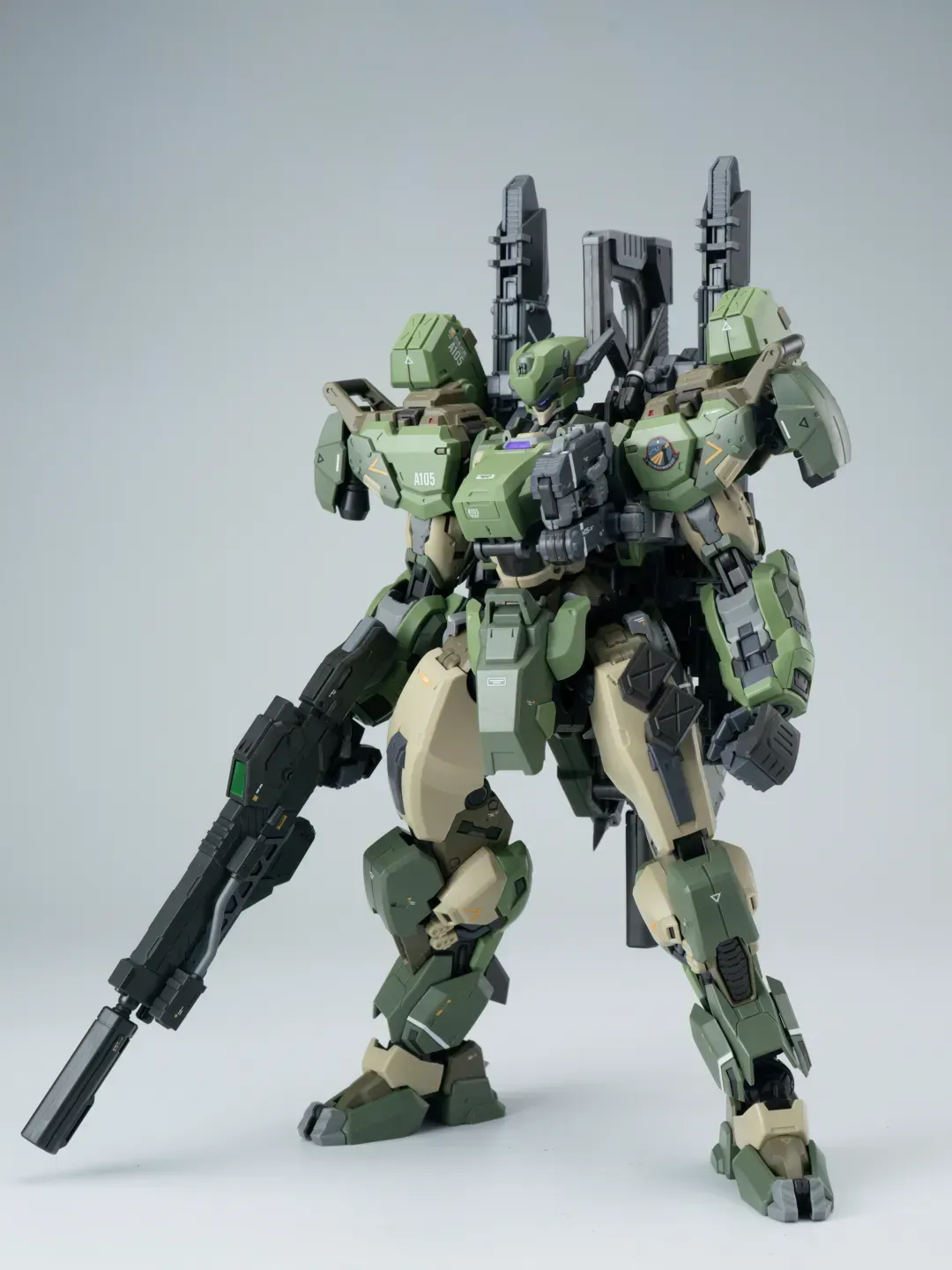 - 제품 컬러는 옅은 그린과 짙은 그린으로 투톤 분할했고 그레이와 채도가 낮은 베이지 컬러로 구성됐습니다. 카모폴라쥬 느낌의 색 구성인지라 육전형 기체라고 할 수 있겠군요.
