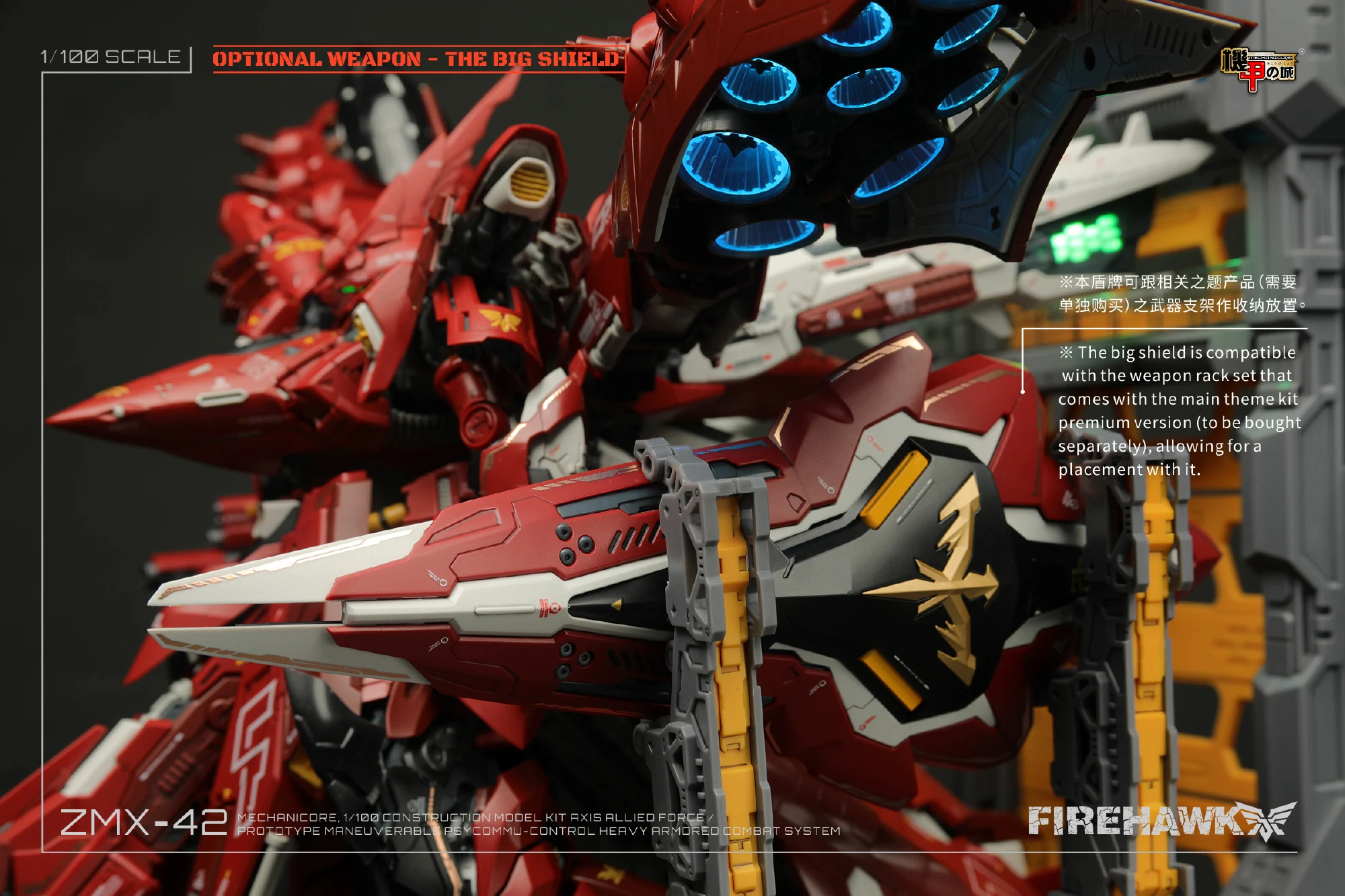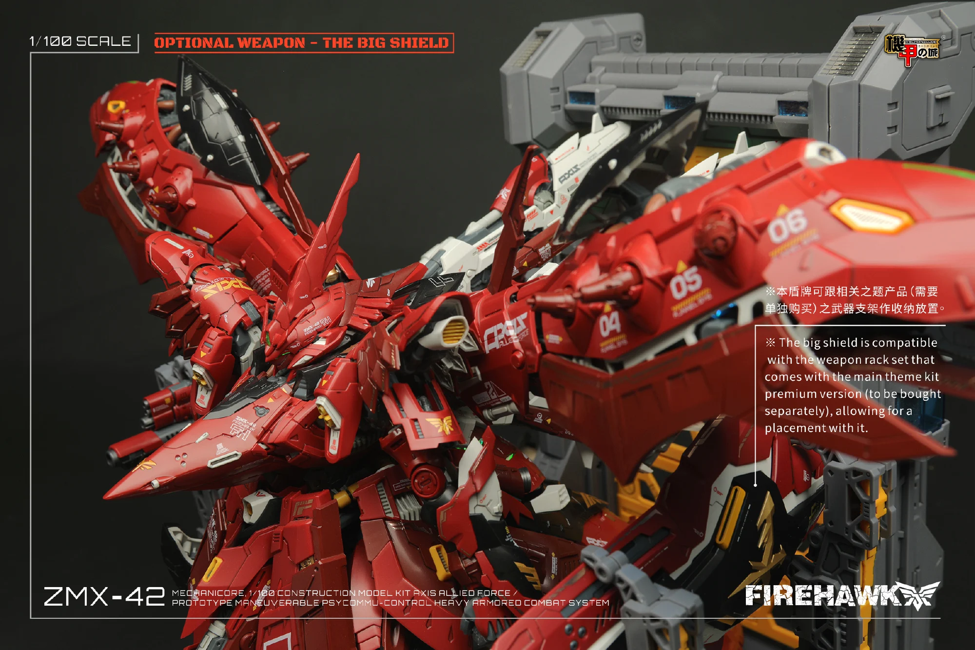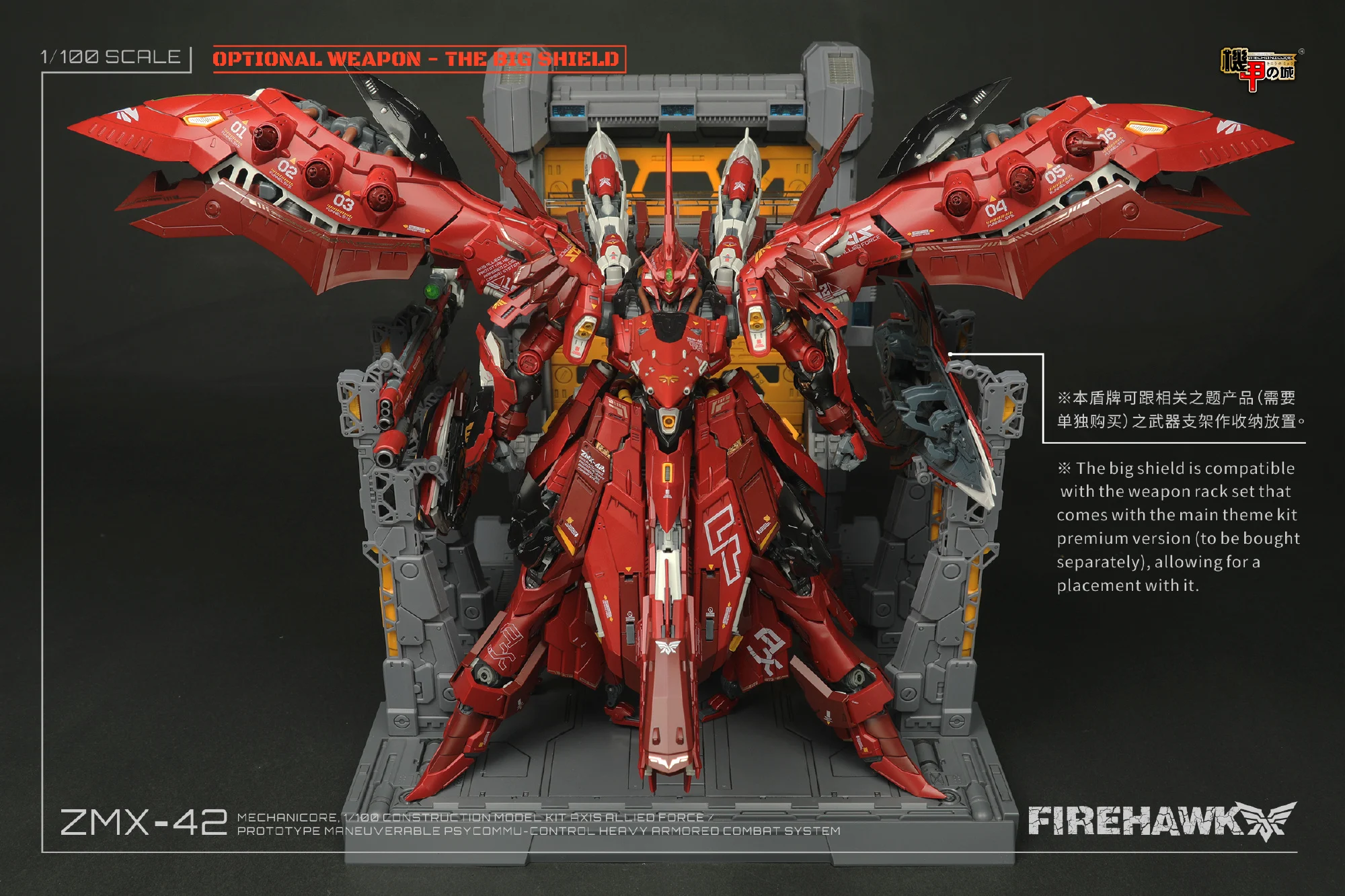 메카니코어는 2023년 12월, 10주년 기념으로 1/100 파이어 호크(마개조 나이팅 게일/모터헤드) 예약 판매를 진행했었죠. 이후 2024년 9월에 갑자기 파이어 호크 극지 작전 버전(화이트 컬러)을 공개하며 예약 판매하더니…전용 대형 쉴드 파츠를 예약가 88위안(108위안) 개별 판매했던 기억이 나는데요. 최근 이 대형 쉴드 파츠의 작례 사진과 출하 관련 공지가 올라왔군요 ^^;;
