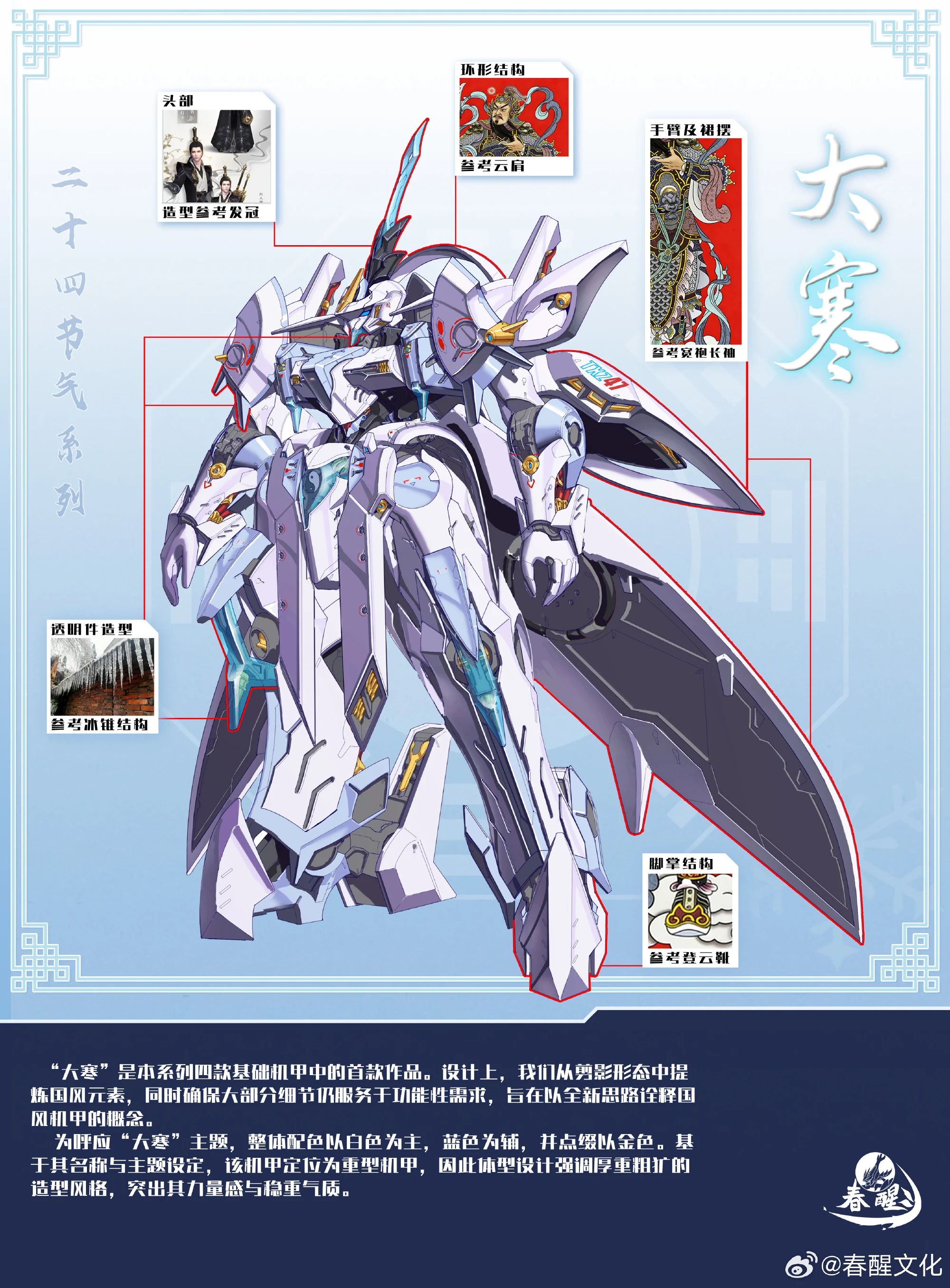 이어서, 대한의 일러스트 이미지와 T0 단계의 테스트 샘플 런너 사진이 공개됐습니다. 우선 머리, 백팩 및 대검, 발 등의 조형은 중국 전통 의상을 참고해 디자인 됐다고 하며, ‘대한(큰 겨울/추위)’라는 의미답게 이펙트 파츠는 얼음의 형상과 컬러를 가져온 모습이네요. 그리고 테스트 샘플 런너는 T0 단계임에도 세세한 부분에 디테일들이 들어가 있고 사출 품질도 깔끔한터라 한번 기대해봐야겠습니다 ^^;