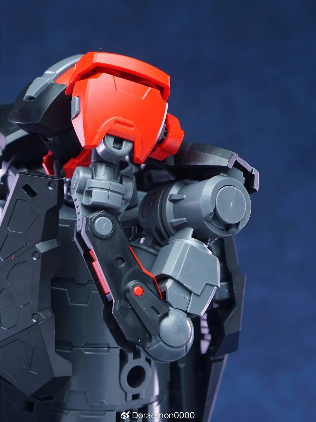| 외장 파츠는 근육질의 몸을 보여주는 느낌이며 부분 부분 적용된 신축성 있는 빨간색 연질 파츠도 가동시 마치 근육처럼 연동됩니다 |