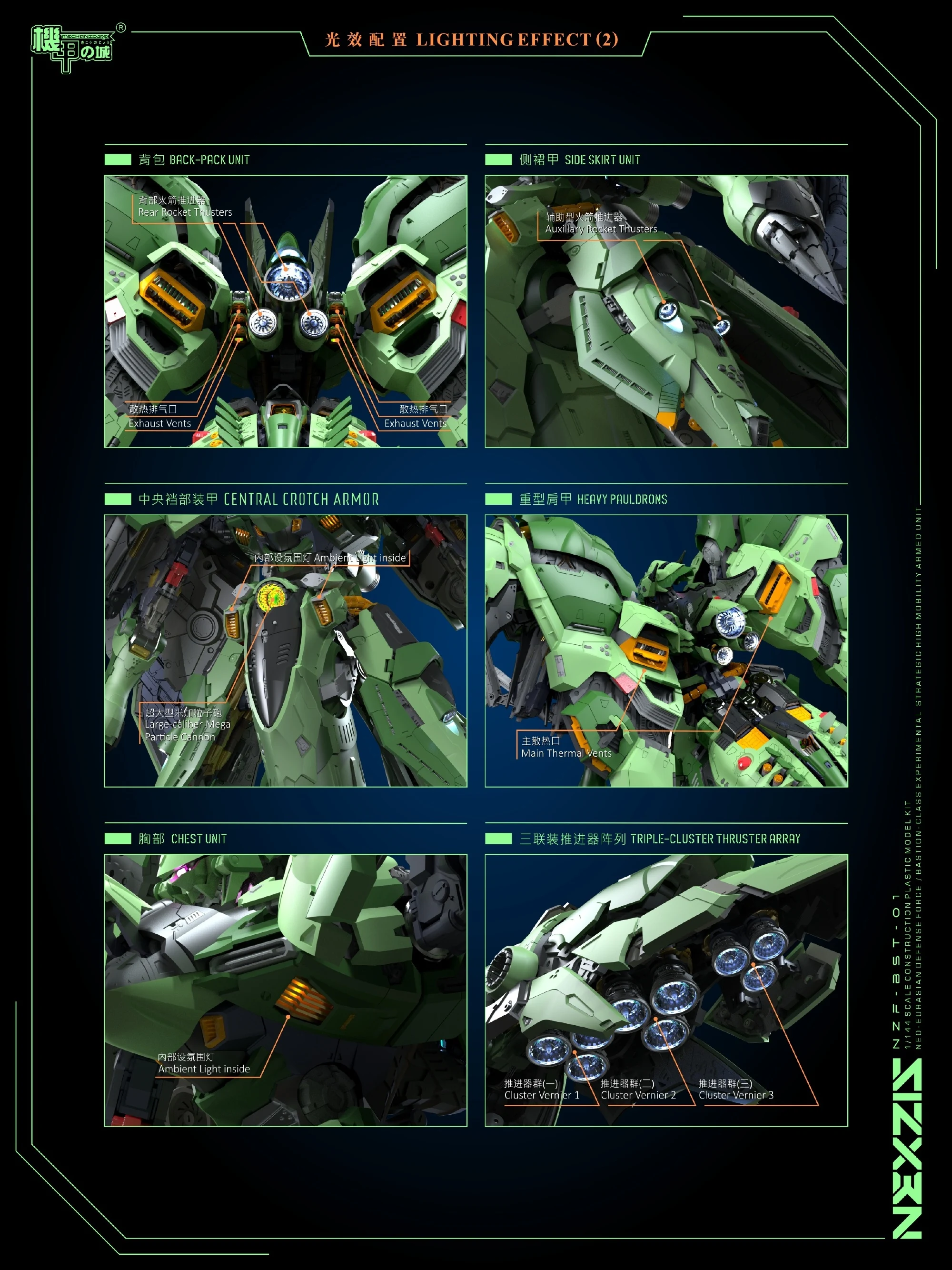 이어서 내부 프레임 클로즈업 이미지를 보니 구조 및 정보량은 메카니코어답게 상당하고, LED 유닛은 눈과 이마 쪽, 어깨 바인더의 아이 필드 제네레이터와 메가 빔 입자포, 후면 스러스터 유닛 등에 삽입되어 멋진 전시 효과를 보여줄 것으로 예상됩니다.