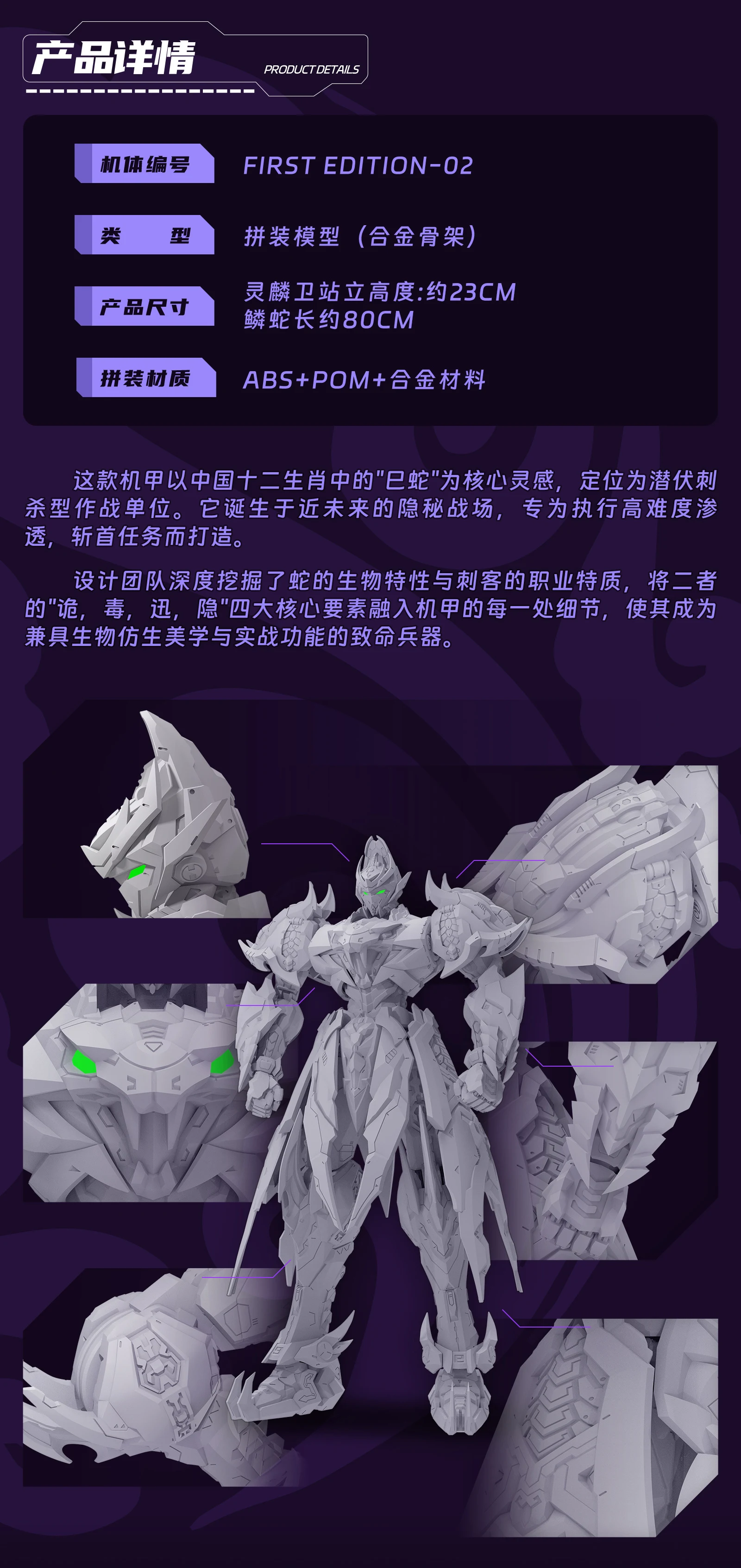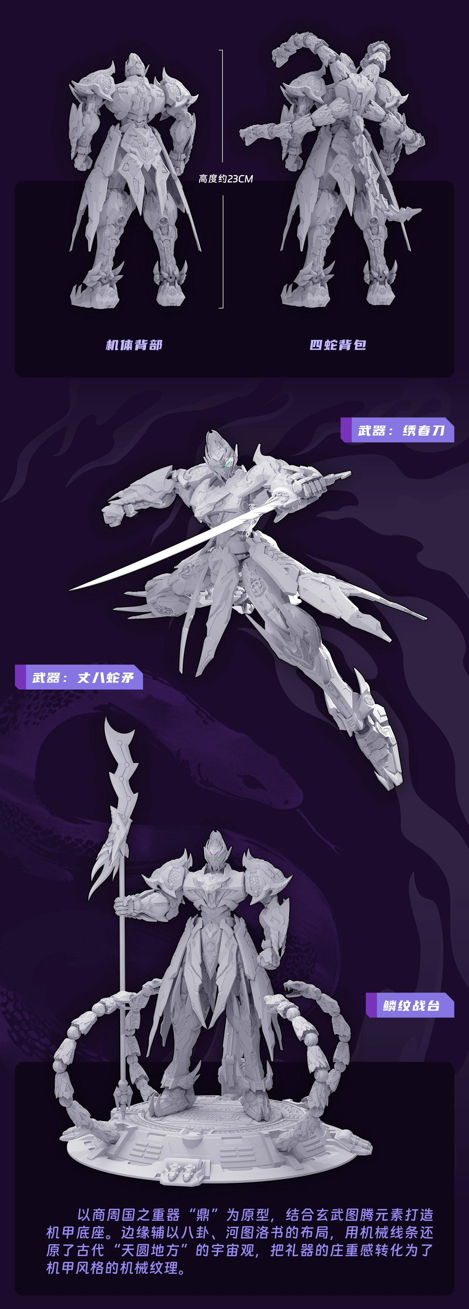 일단 공개된 제품 정보를 살펴보면...영린위 사사는 십이지 중 뱀이며, 합금프레임이 동봉된 프라모델 제품입니다. 크기는 머리까지 약 23cm인데...따로 뱀 유닛 파츠가 동봉됩니다. 뱀의 경우, 뱀 머리를 장착해 4마리까지 만들어 백팩에 장착하거나, 하나의 머리 파츠로 거대한 뱀으로도 만들 수 있습니다. 하나로 연결할 경우, 뱀의 전체 길이는 약 80cm입니다 ^^;;;; (* 길이 좀 그만 늘려…) 그 외, 중국 고대 상나라/주나라의 주물 솥과 현무 토템 요소에 팔괘 문양 등이 결합된 베이스도 동봉되네요.