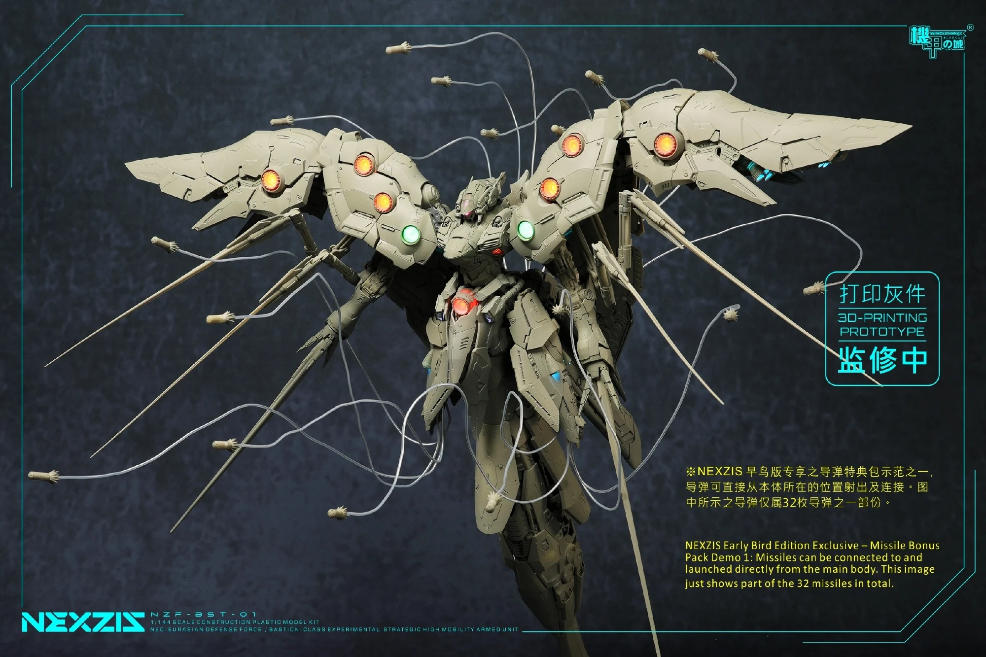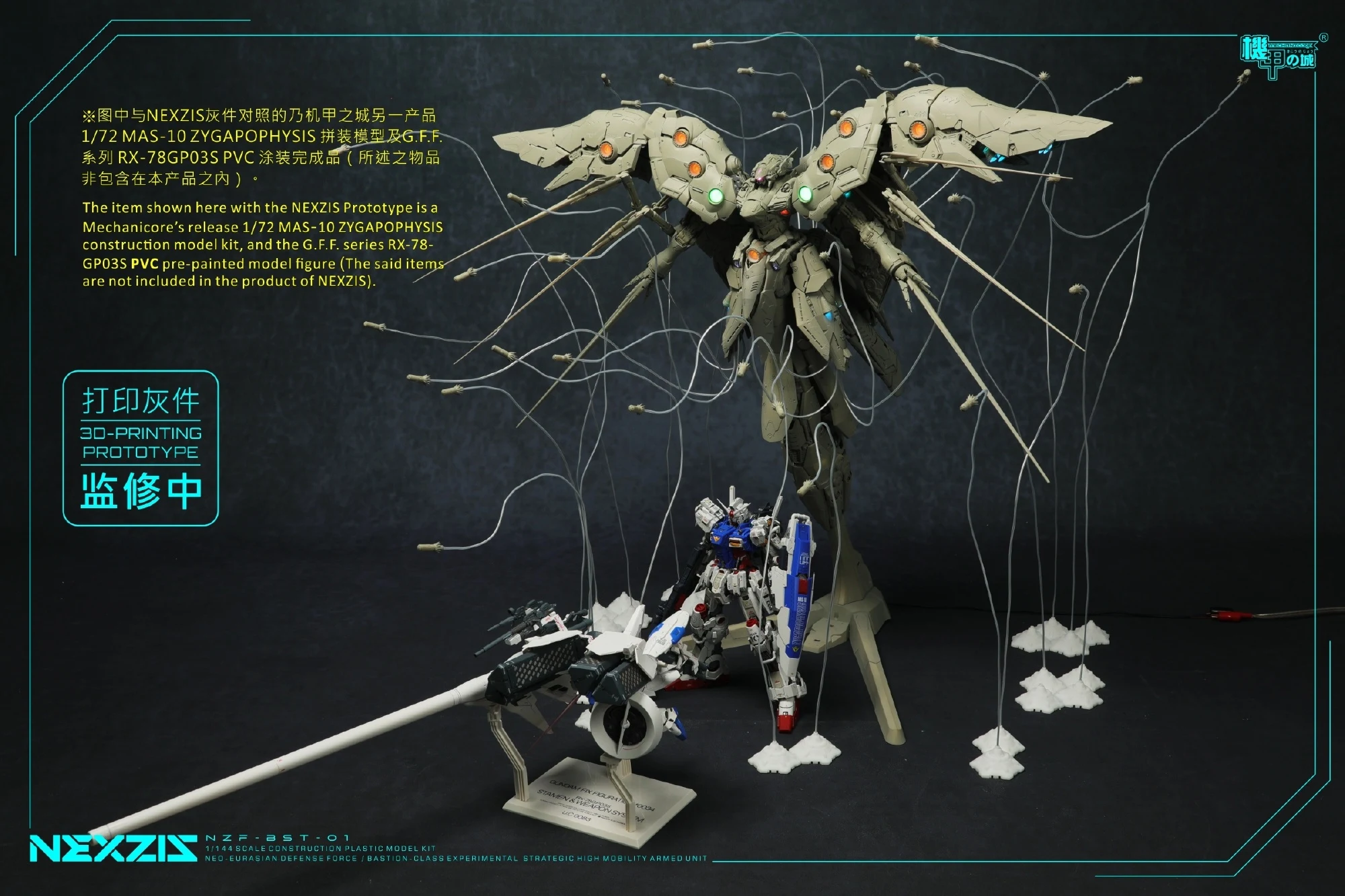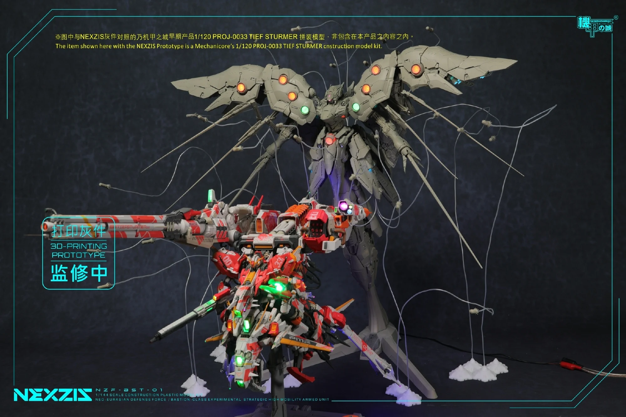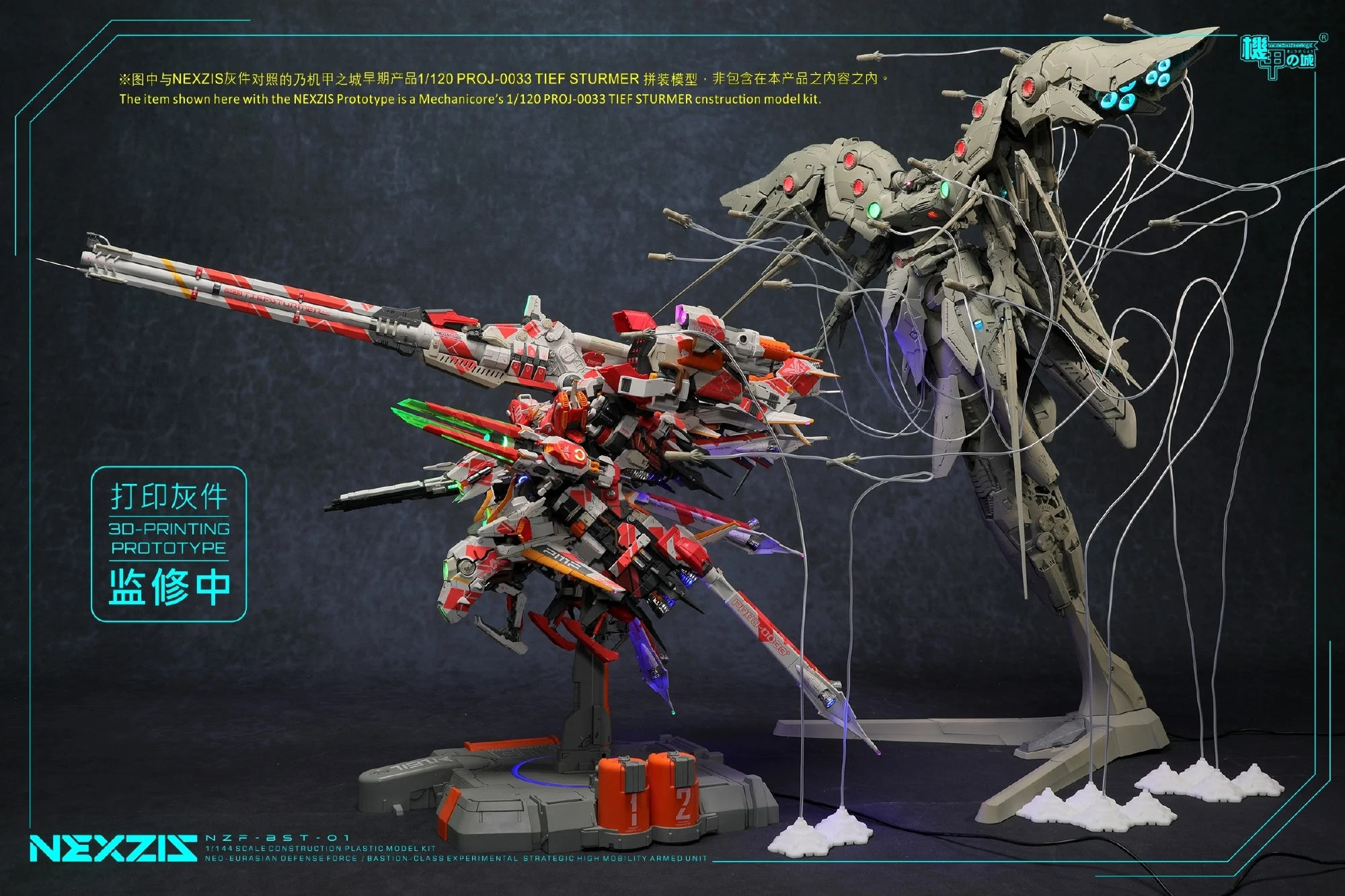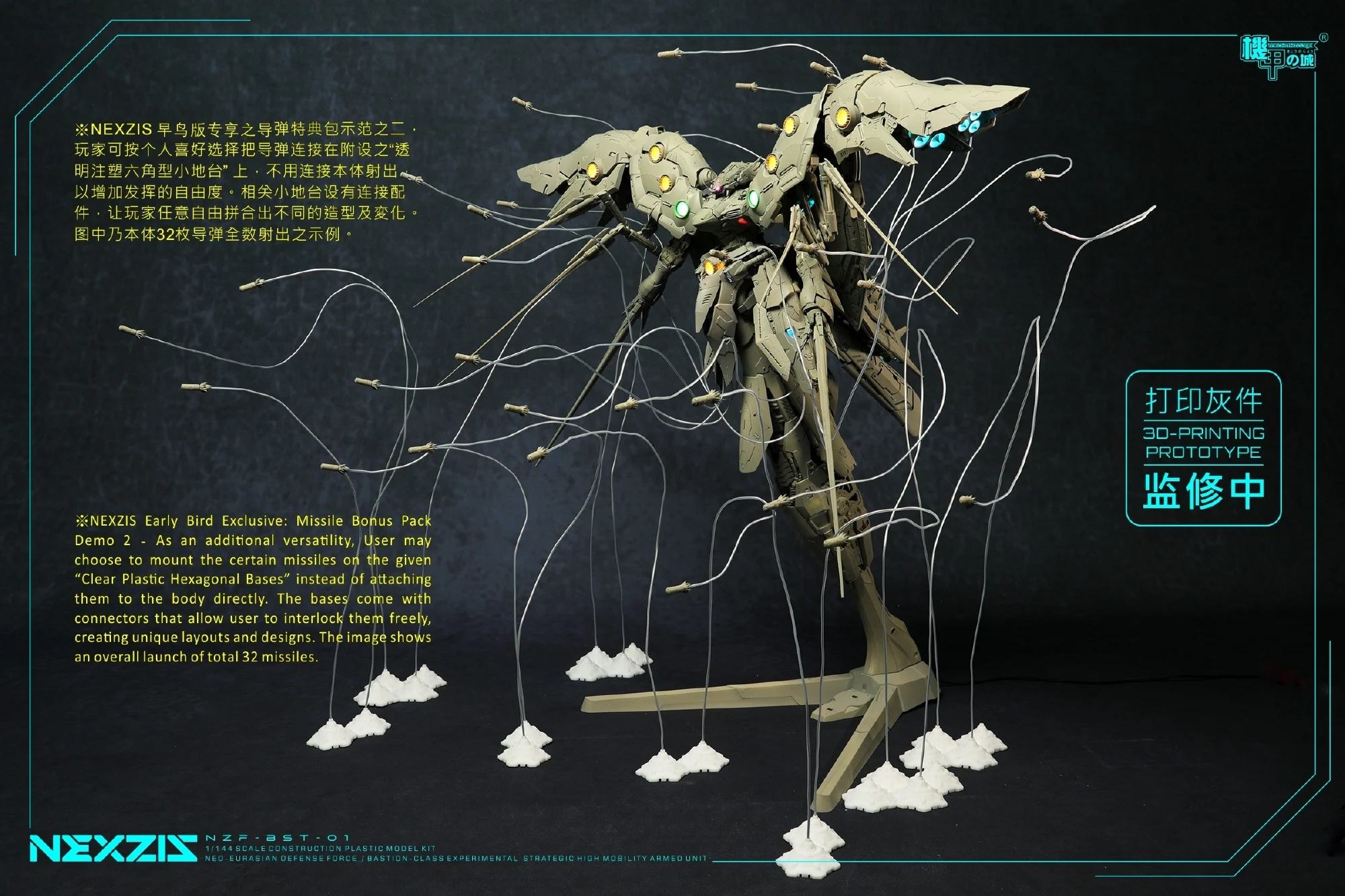 메카니코어에서 1/144 넥스지스(노이에질; 프라모델)의 얼리버드 특전인 미사일 전시용 이펙트 파츠/와이어/소형 스탠드 및 제품 크기를 가늠할 수 있는 크기 비교 사진을 공개했습니다. 특전을 어떤 식으로 활용, 전시할 수 있는지와 어마무시한 크기를 한번 더 확인할 수 있는 사진이 되겠네요.
