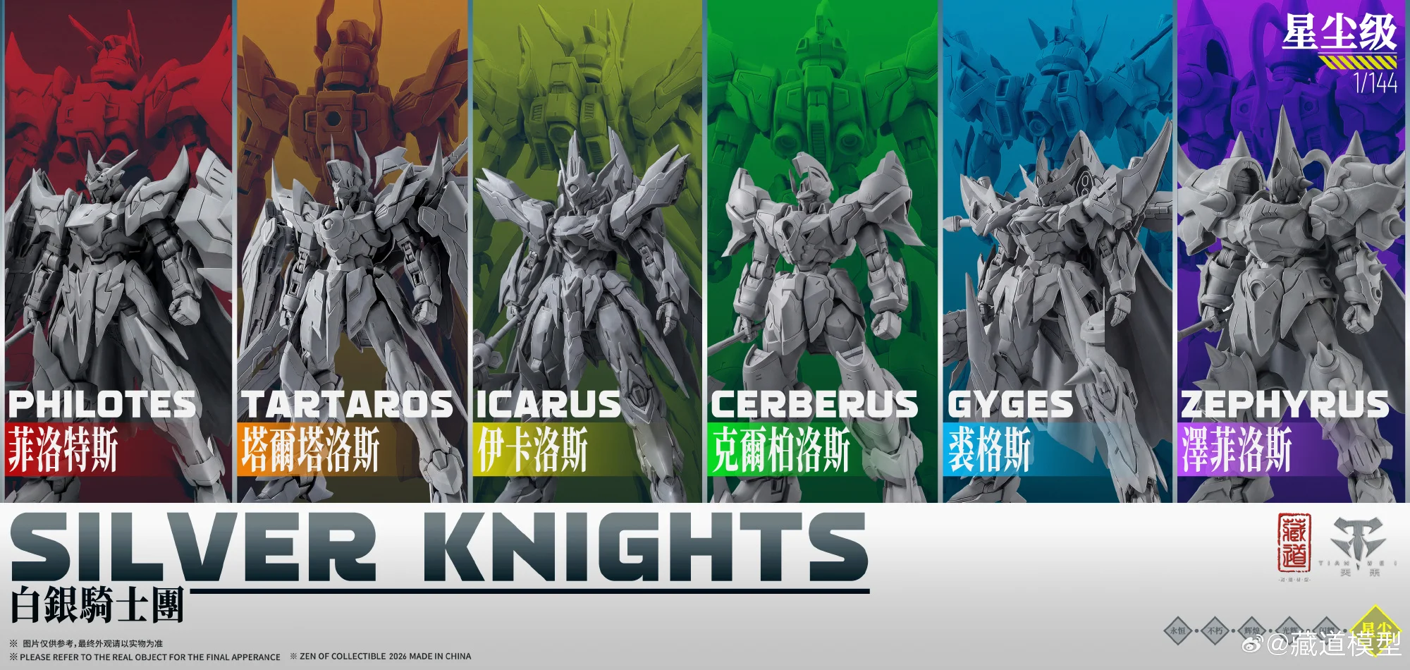 - 실버 나이츠는 총 6개 기체로 구성되어 있으며 각각 필로테스, 타르타로스, 이카루스, 케르베로스, 기게스, 제피로스입니다.