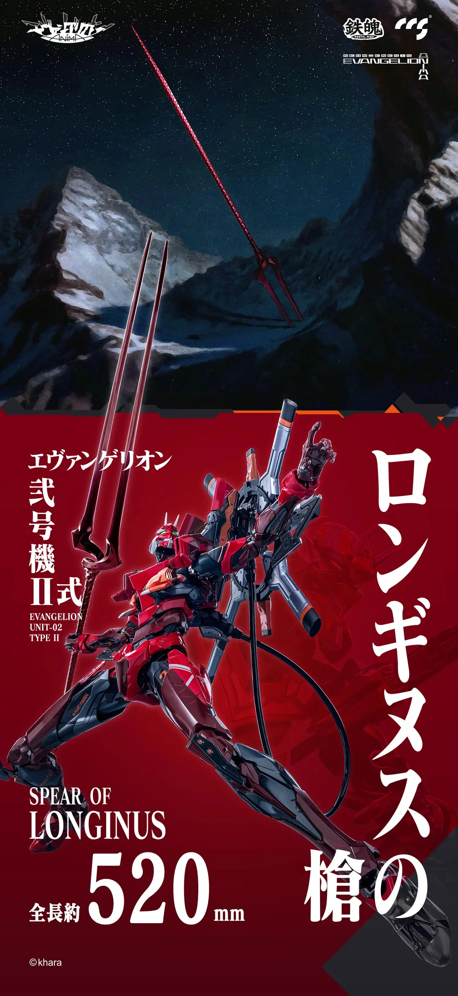 제품 정보를 살펴보면 크기는 머리까지 약 28.5cm, 어깨 무장 포함시 31~32.5cm이며, 무게는 합금프레임을 포함해 약 520g입니다. 롱기누스의 창은 약 52cm나 되네요. 그 외, 렉테나(30cm), 엄빌리컬 케이블(39cm), LMG 파츠, N2 폭탄, 신형 팔레트 라이플 등이 풍성하게 동봉됐습니다.