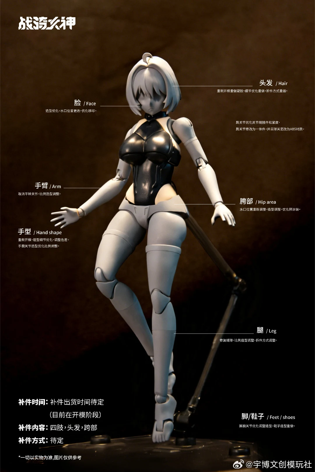 헤어: 신규 조형, 딱딱한 소재, 디테일 개선, 분리 방식 개선 얼굴: 조형 개선, 게이트 위치 변경, 프린팅 개선 어깨 관절: 관절 강도 개선, 일체형으로 변경, 볼 관절은 POM 소재 적용 고관절: 조형 변경, 게이트 위치 변경 손: 신규 조형, 디테일 개선, 컬러 차이 조정, 팔목 조형/프로포션 개선 발/신발: (발) 관절 개선, 조형 조정 / (신발) 신규 조형 |