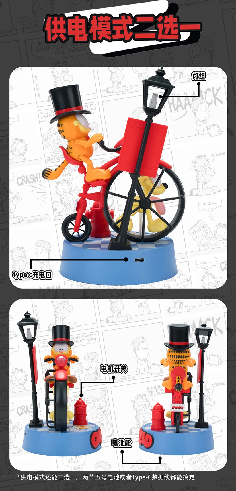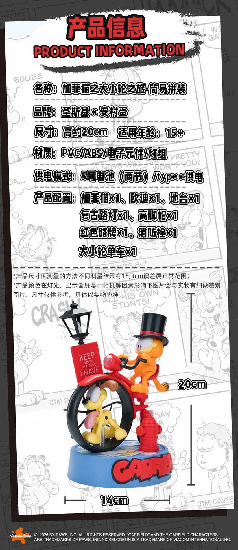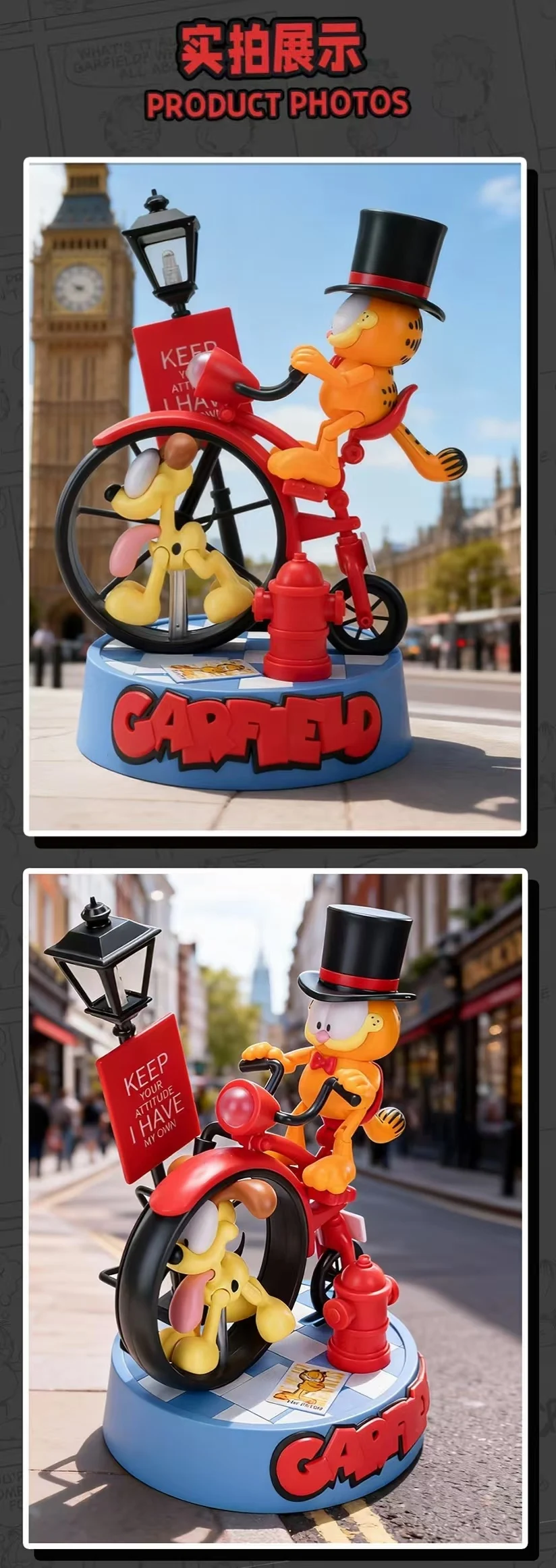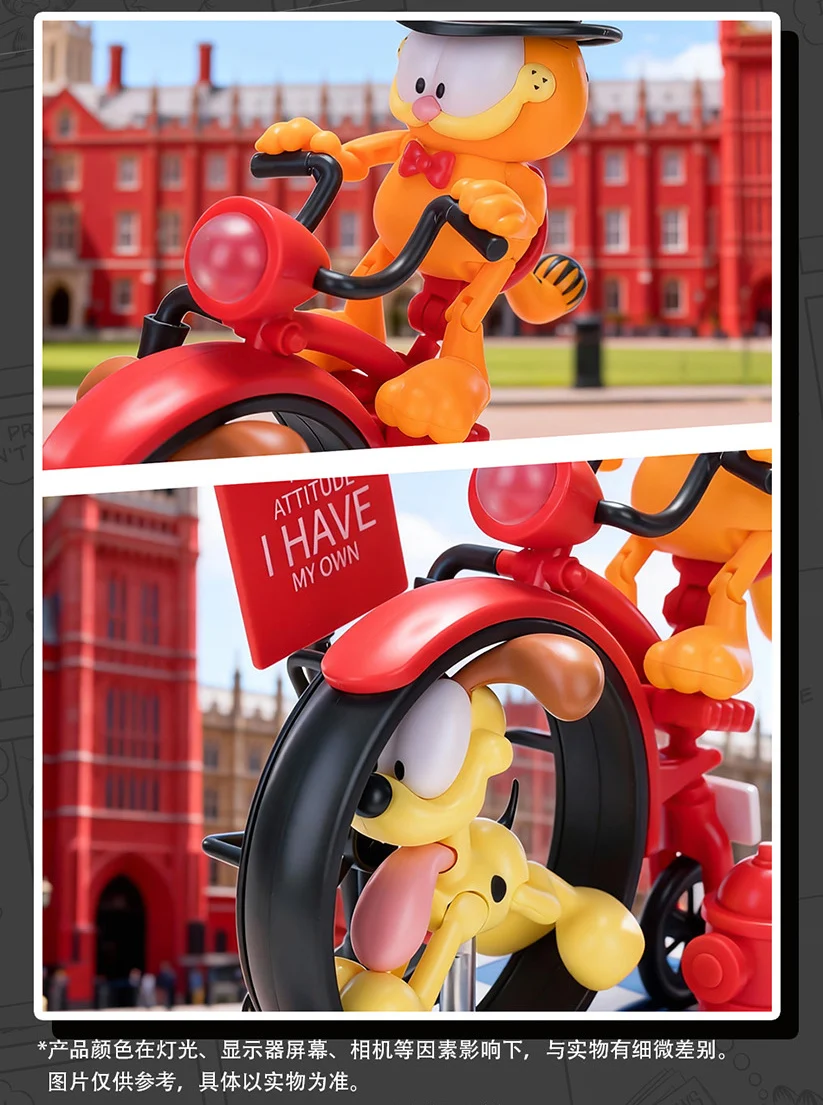- 구성품: 가필드, 오디(강아지), 베이스, 가로등, 탑 햇(원통형 모자), 표지판, 소화전, 하이휠 자전거