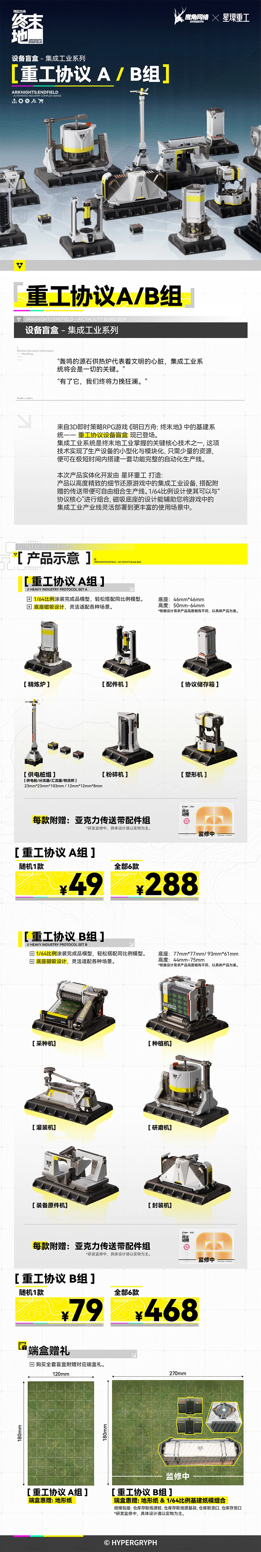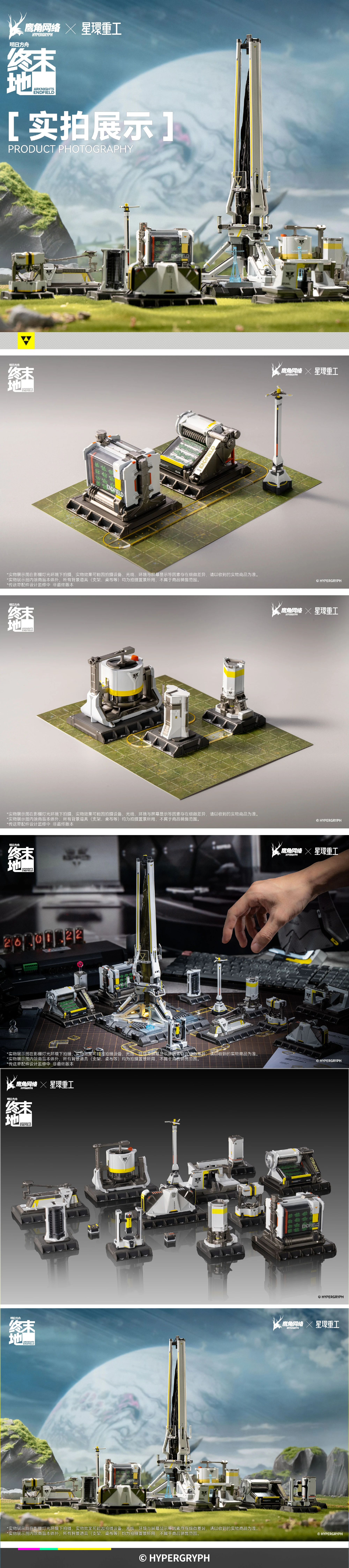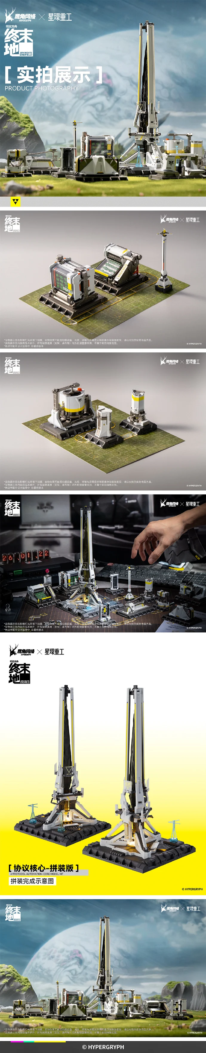 끝으로 프로토콜 코어와 함께 꾸밀 수 있도록 각종 통합 공업 시스템 설비 파츠도 나오는데요. 요건 완성품 상태로 랜덤 박스 방식으로 판매됩니다 ㄷㄷ 프로토콜 코어와 함께 게임 내 모습을 디오라마처럼 구현할 수 있겠군요. 단순 메카나 기체가 아닌 시설물이라니...꽤 재미난 시도로 보입니다. 명일방주: 엔드필드를 좋아하시는 분들 계시면 참고하세요!